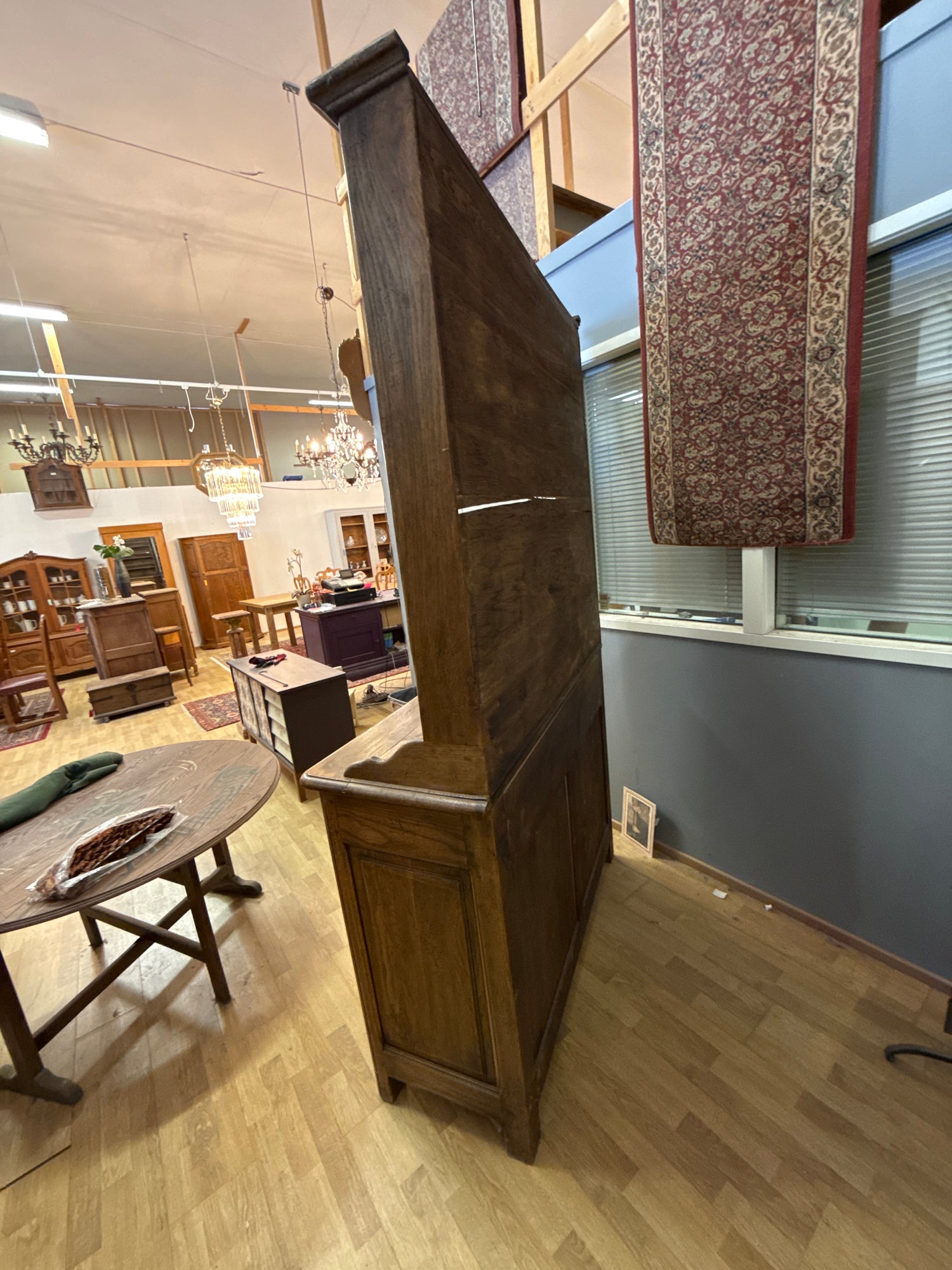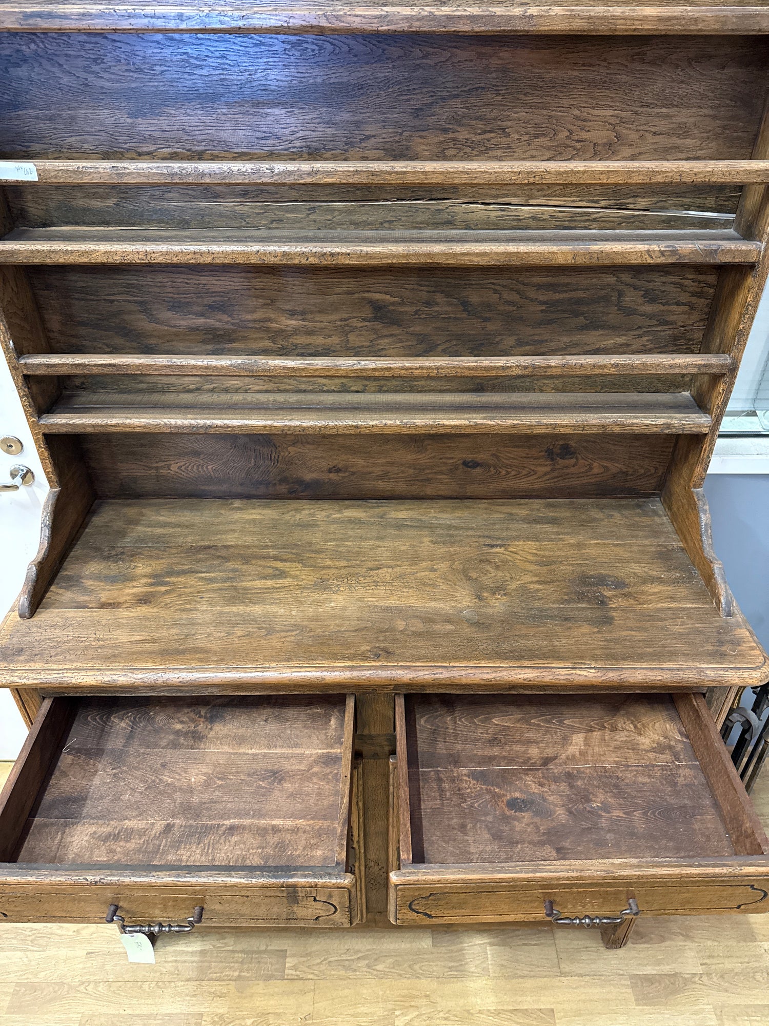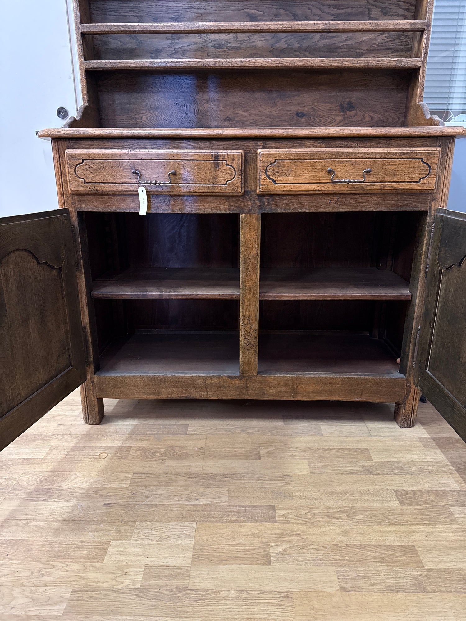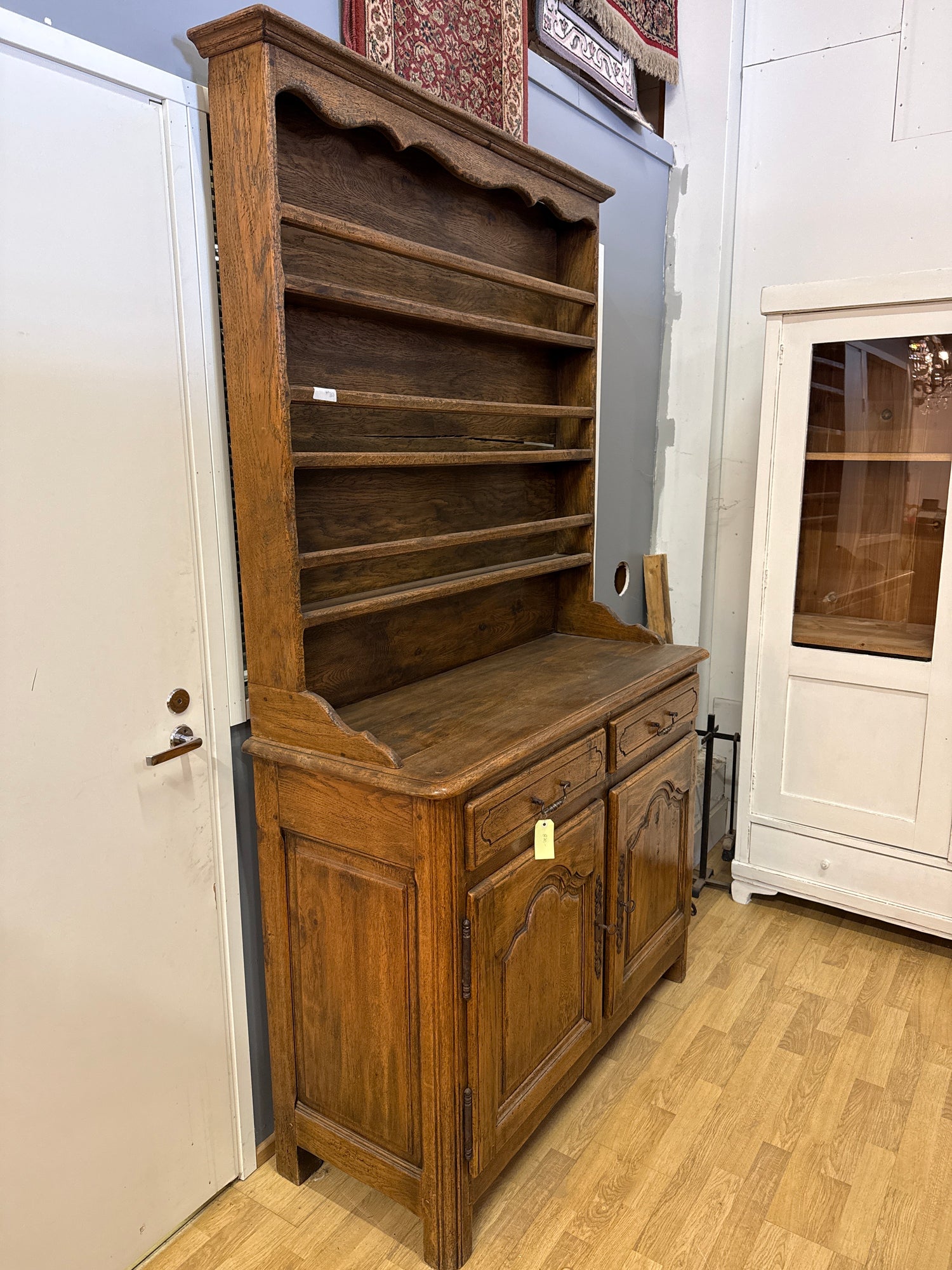 Huikea 1900-luvun alkupuolen astiasenkki lautashyllyllä. Paksusta tammesta valmistettu senkki on upea käsityön taidonnäyte. Se on siisti toimiva ja suoraan käyttöön valmis. Tämä Belgiasta tullut kaluste sopii upeasti monenlaiseen ympäristöön.