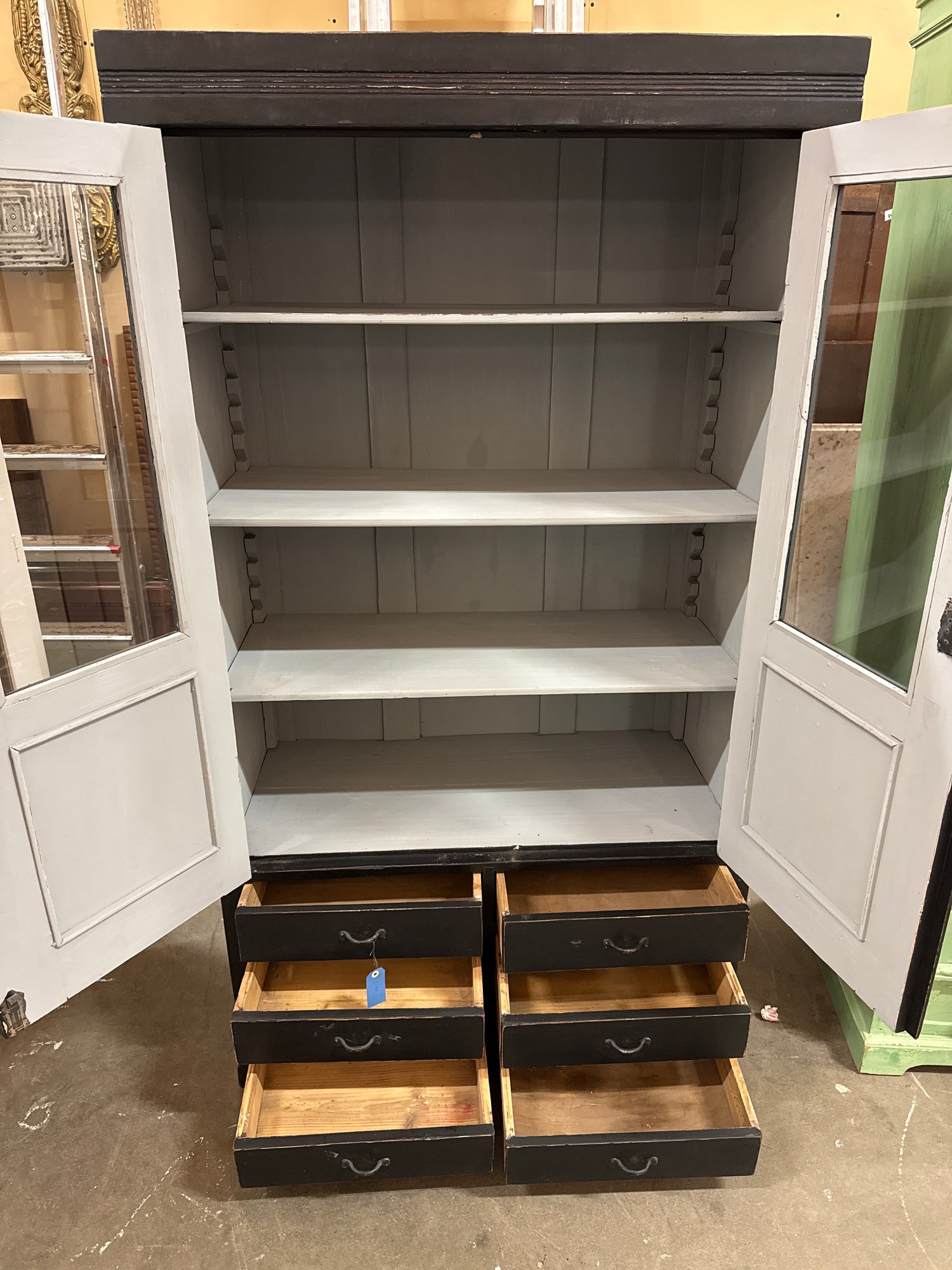 Upea ja harvinainen vitriinikaappi kuudella vetolaatikolla ja kolmella korkeussäädettävällä hyllyllä. Erittäin tasokas noin 100vuotias vitriini on hajuton ja suoraan käyttöön valmis.