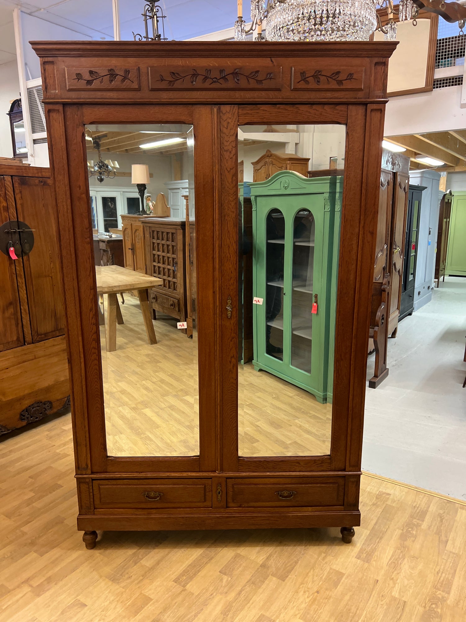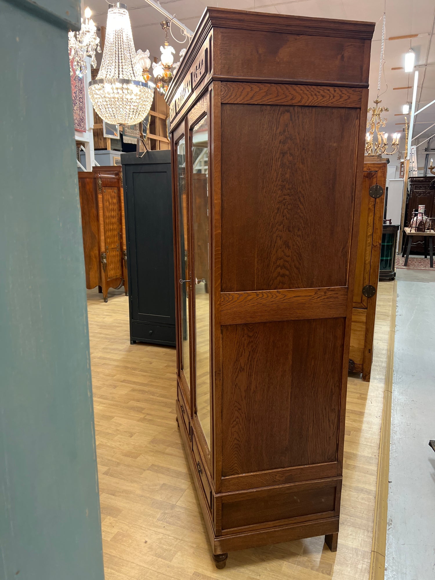 Kaunis, suoralinjainen jugend vaatekaappi tammesta. Kaapissa upeat fasettihiotut peili ja kauniit puu veistokset! Kaappi toimii todella hienosti ja on valmis suoraan käyttöön. Kaappi on 1910-luvulta ja ikäisekseen hienossa kunnossa. Kaapissa on iän tuomaa patinaa ja kulumaa havaittavissa. Kaappi on helppo purkaa osiin ja kasata uudelleen, joten sen saa hyvin toimitettua ahtaastakin paikasta sisään..