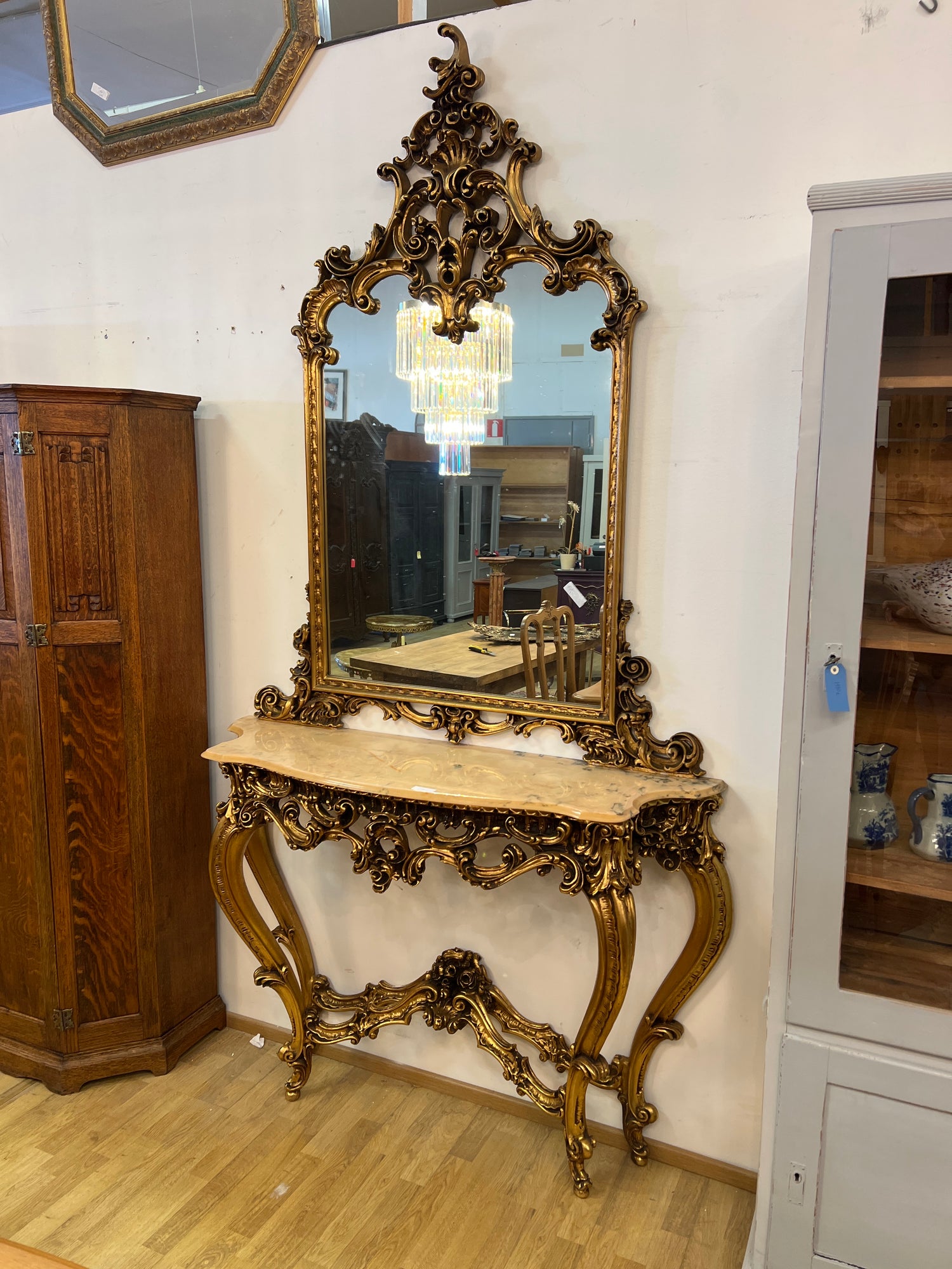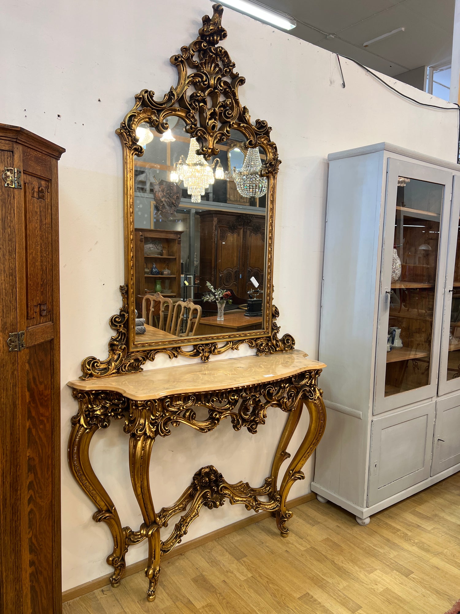 Huikea rokokoo konsolipeilipöytä L. 138cm, S. 41,5cm ja K. 258cm on jälkitoimituksessa ja toimitetaan heti, kun se on saatavilla.