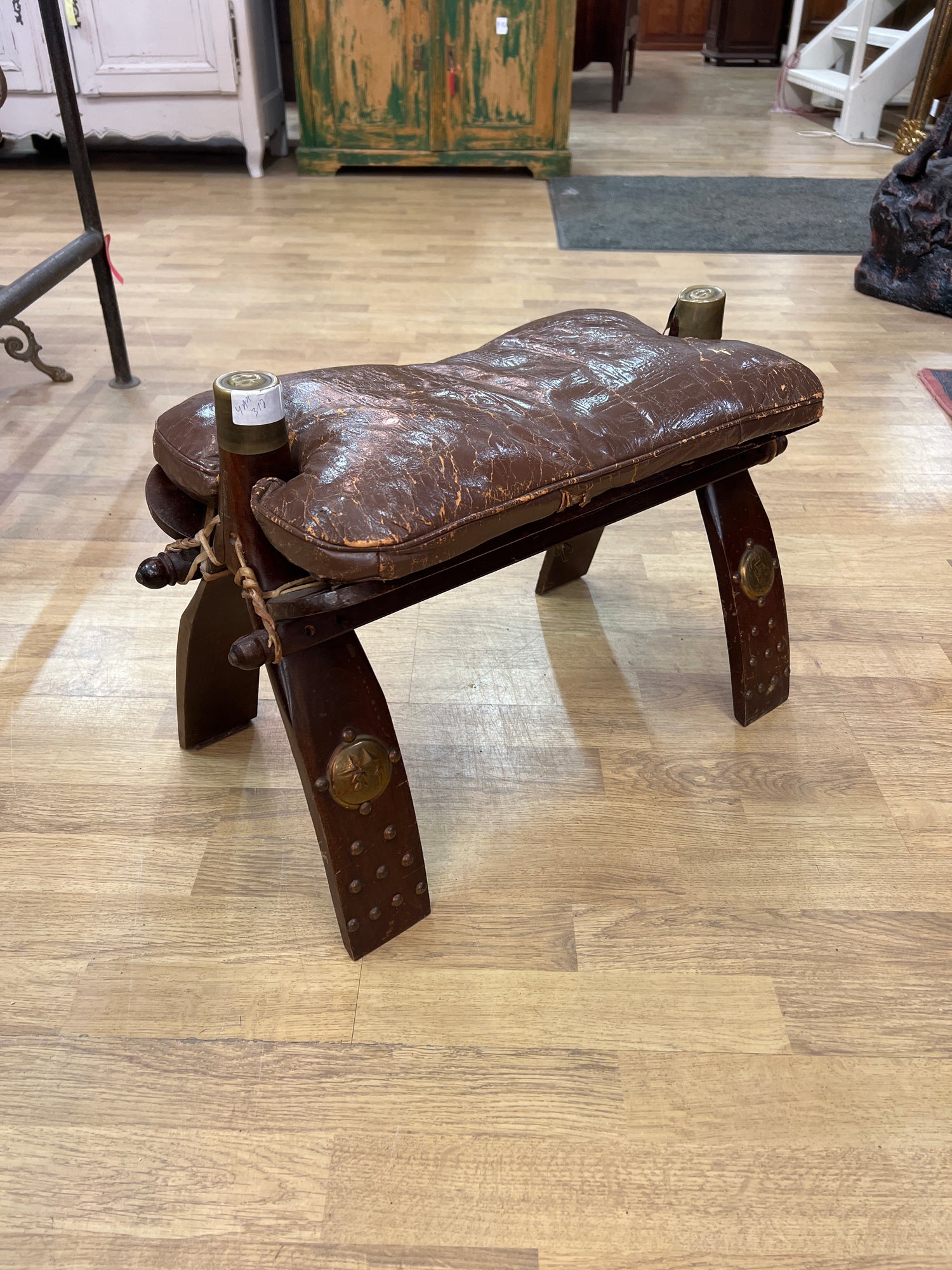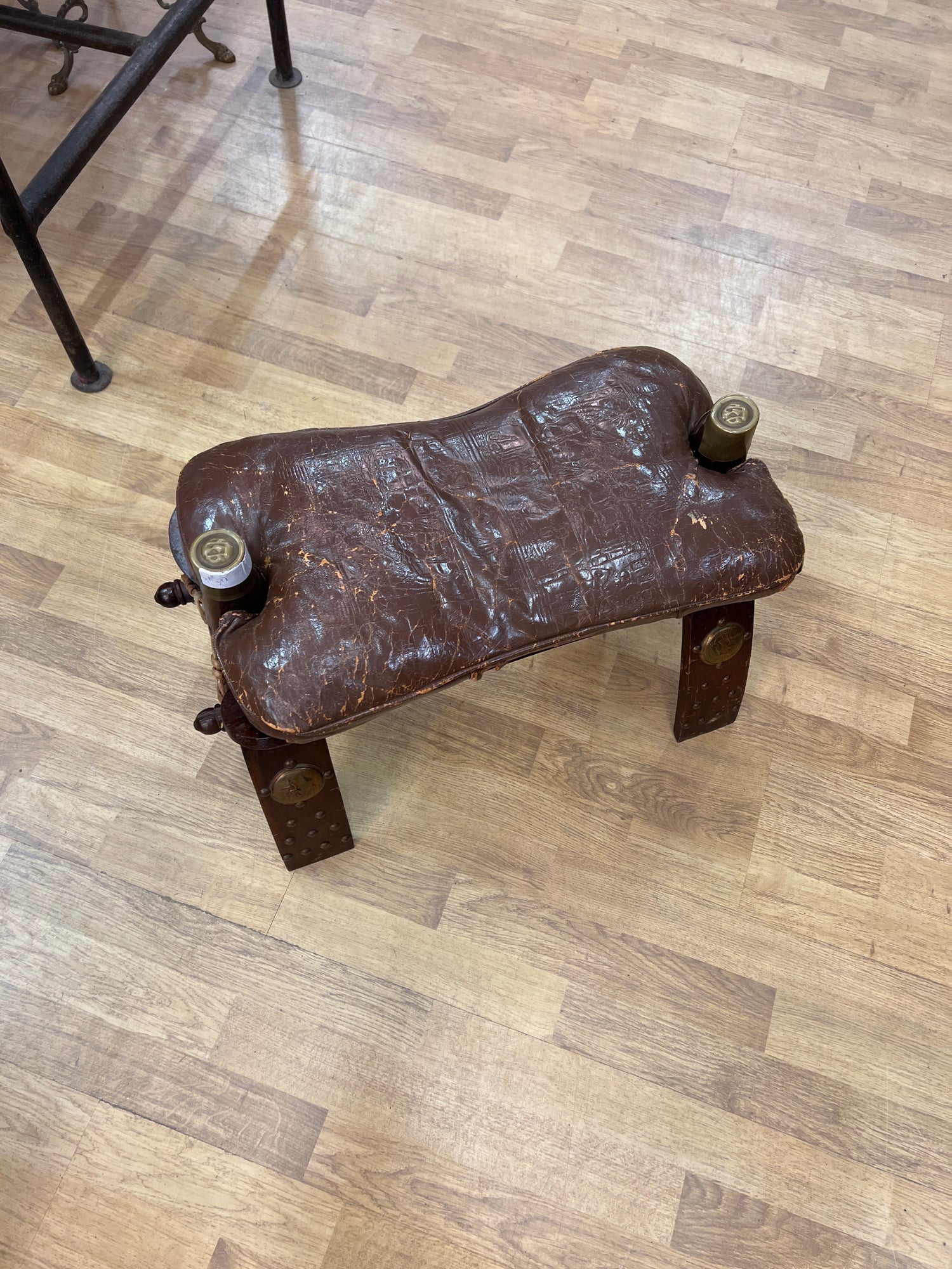Persoonallinen jalkarahi, kengän nauhojen sidonta jakkara, lisä jakkara tai mitä vaan! Kamelin satulana toiminut. Hienosti patinoitunut ruskea nahka pehmuste.