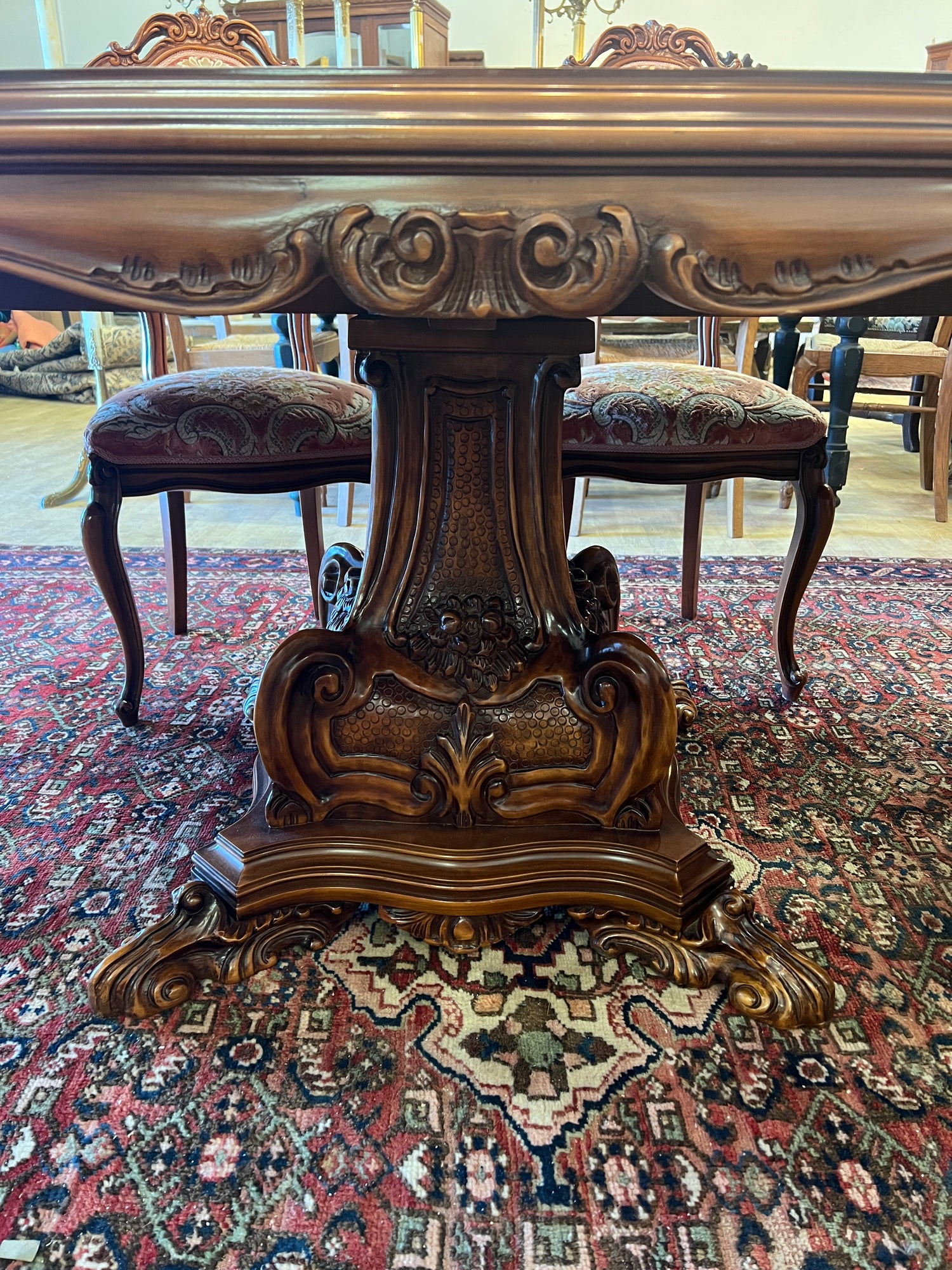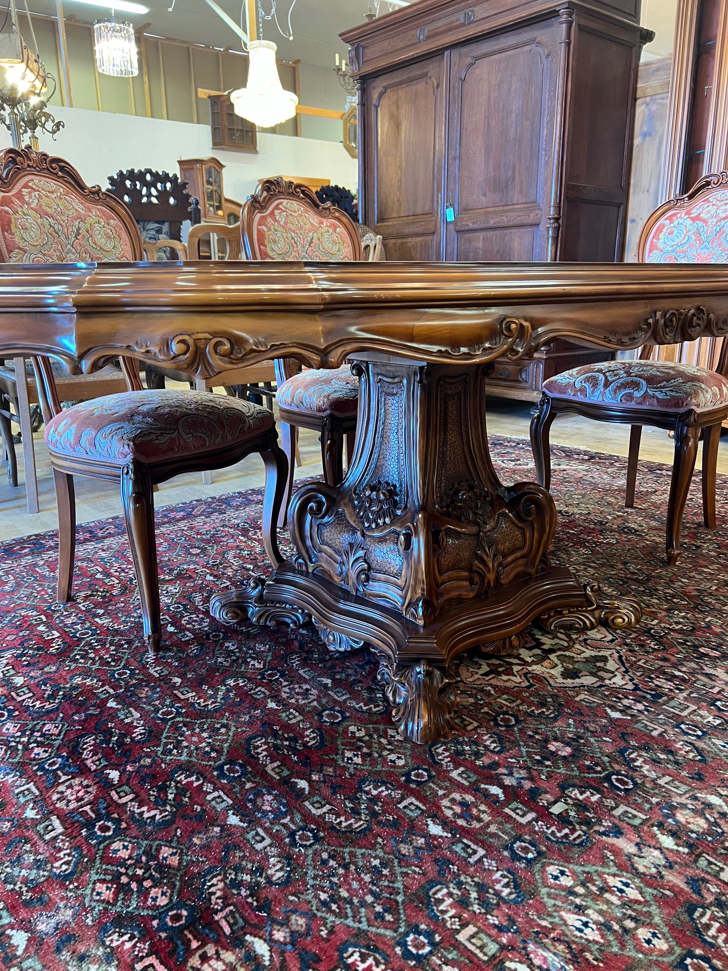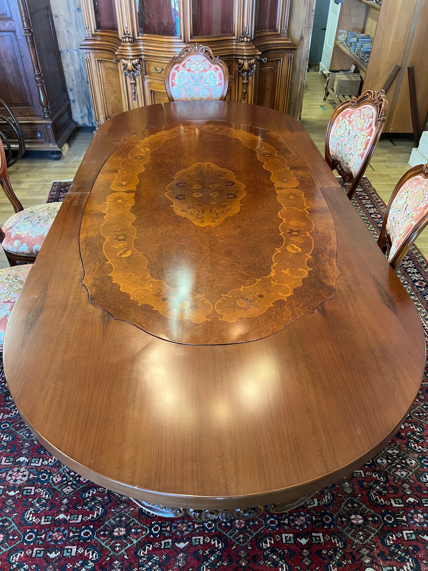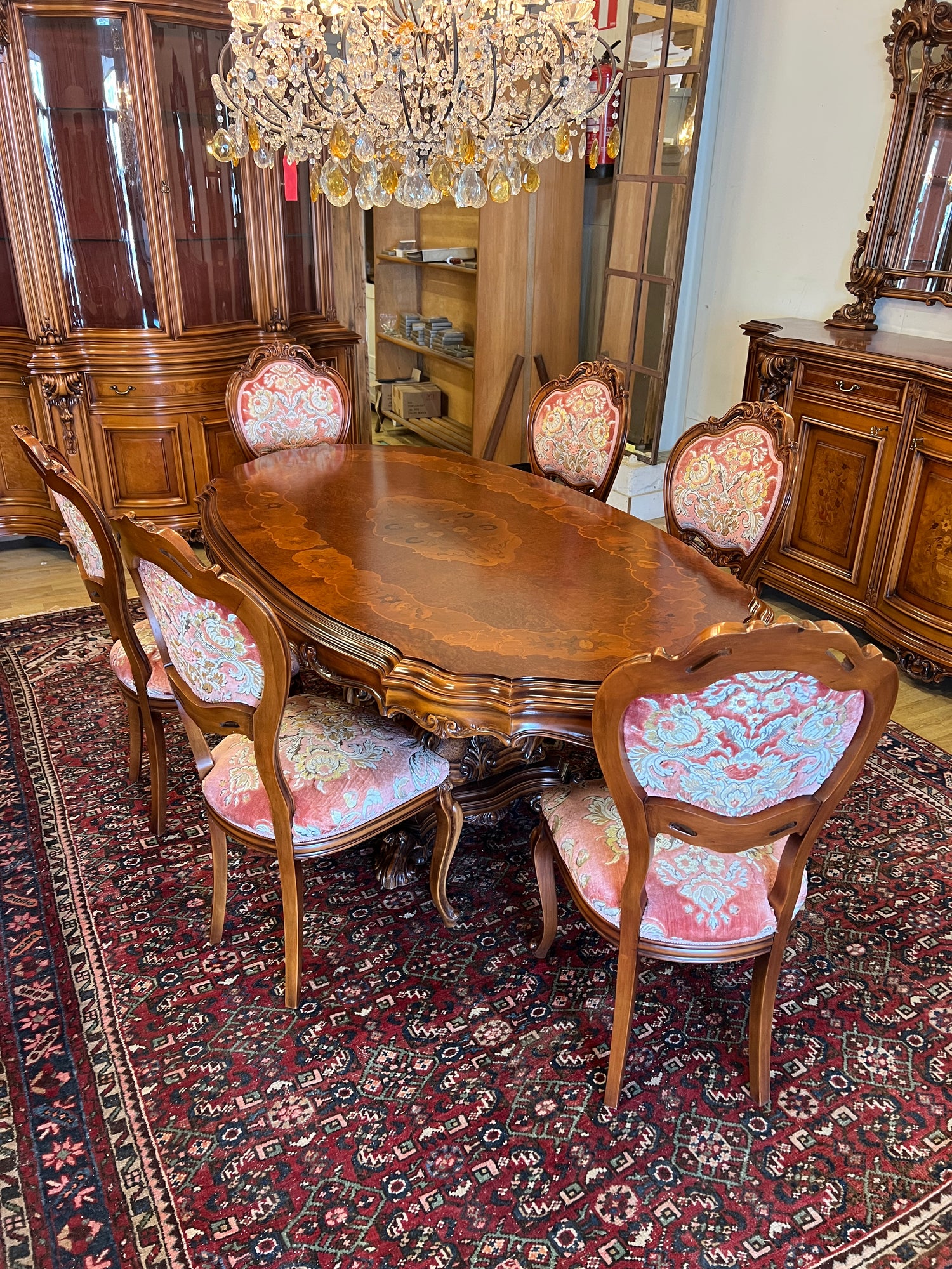 Uskomattoman kaunis italialainen ruokasalikalustokokonaisuus. Pöytä + 6 tuolia, astiakaappi, senkki + peili.