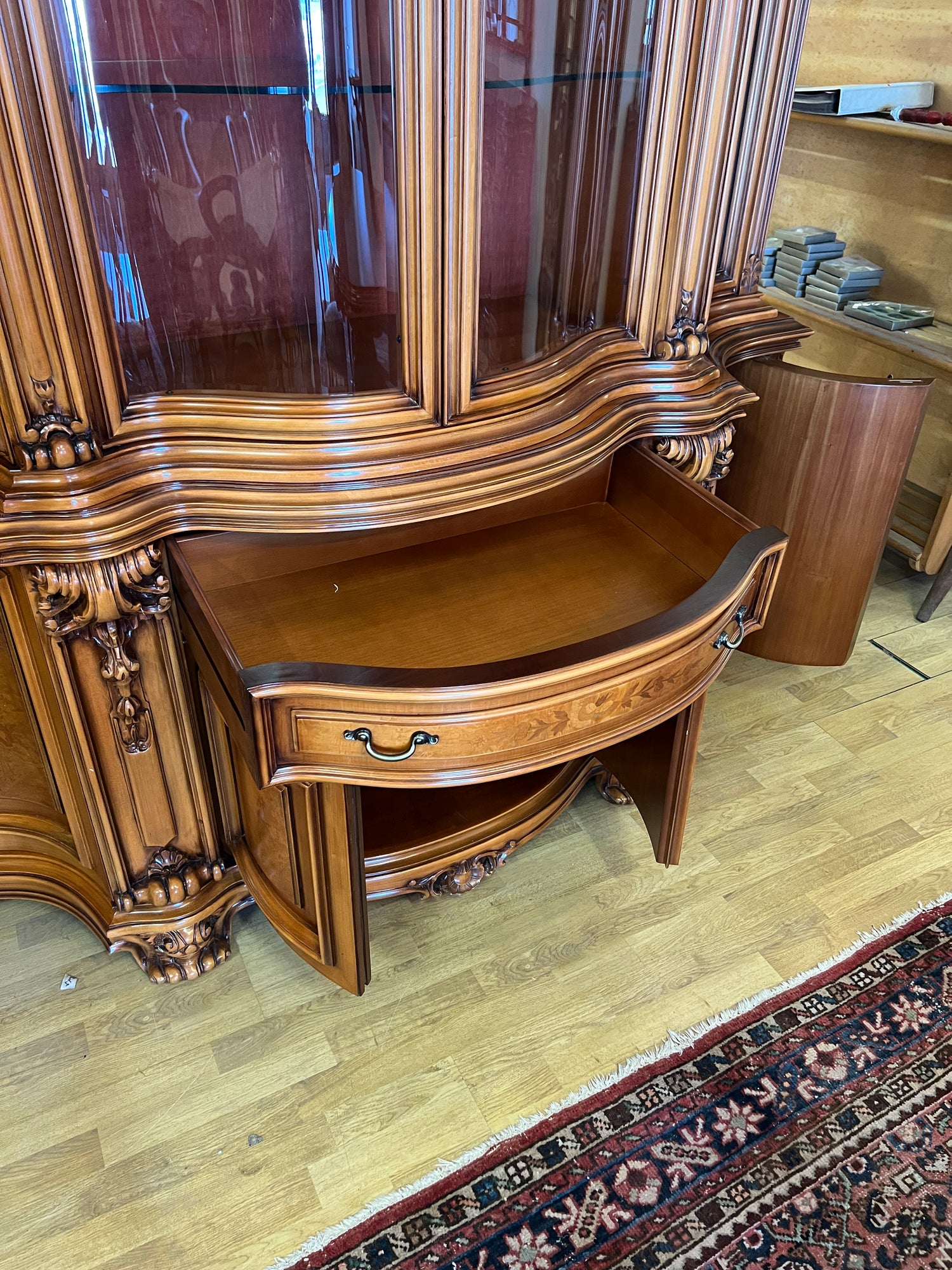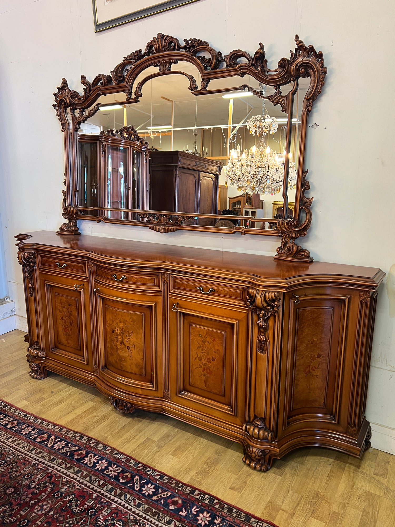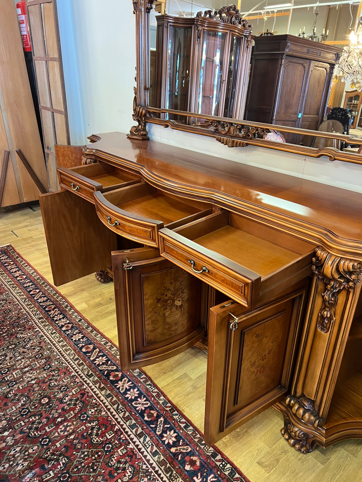 NYT ON TILAISUUS!!! Erittäin harvoin tarjolla oleva italialainen ruokasalinkalusto. Tästä ei laatu parane. On lohenpyrstoliitosta, intarsiatyötä, fasettihiottuja laseja ym ym ym… Todella hienossa kunnossa oleva kokonaisuus. Kaikki lukot toimii moitteetta, avaimet kaikkiin oviin tallessa.
