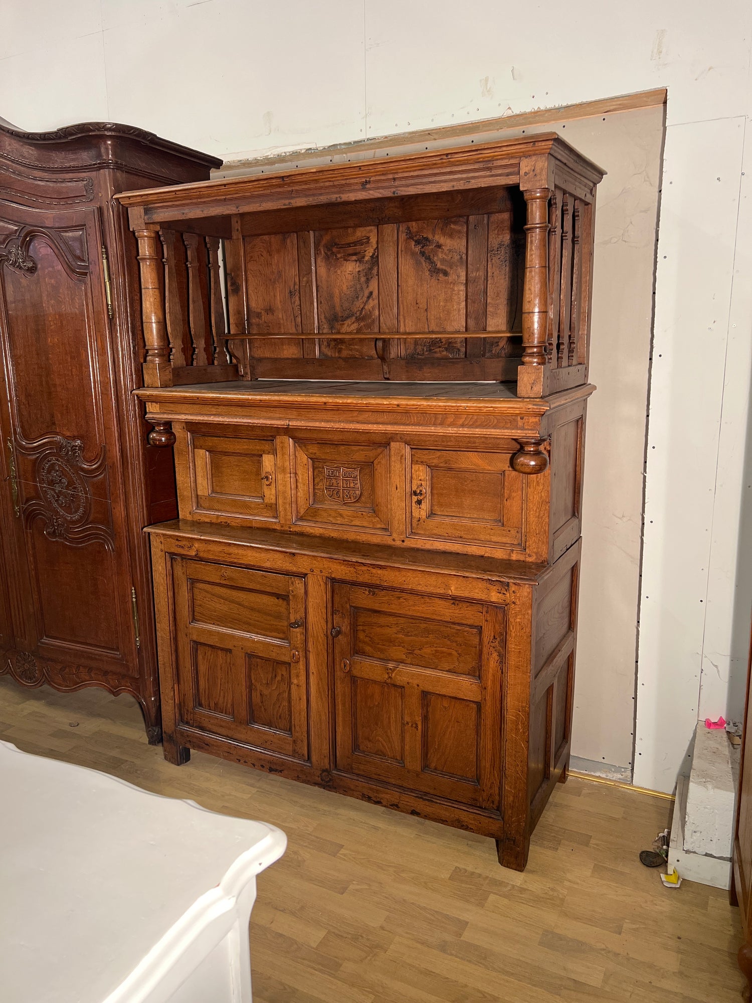 Upea antiikinhelmi😍 Nyt on laatua, näköä ja historiaa! Tämä upea käsityönä valmistettu tammi kaapisto on Johan Georg nimisen kirkon puusepän valmistama myöhäis renesanssi kaappi 1684 vuodelta.