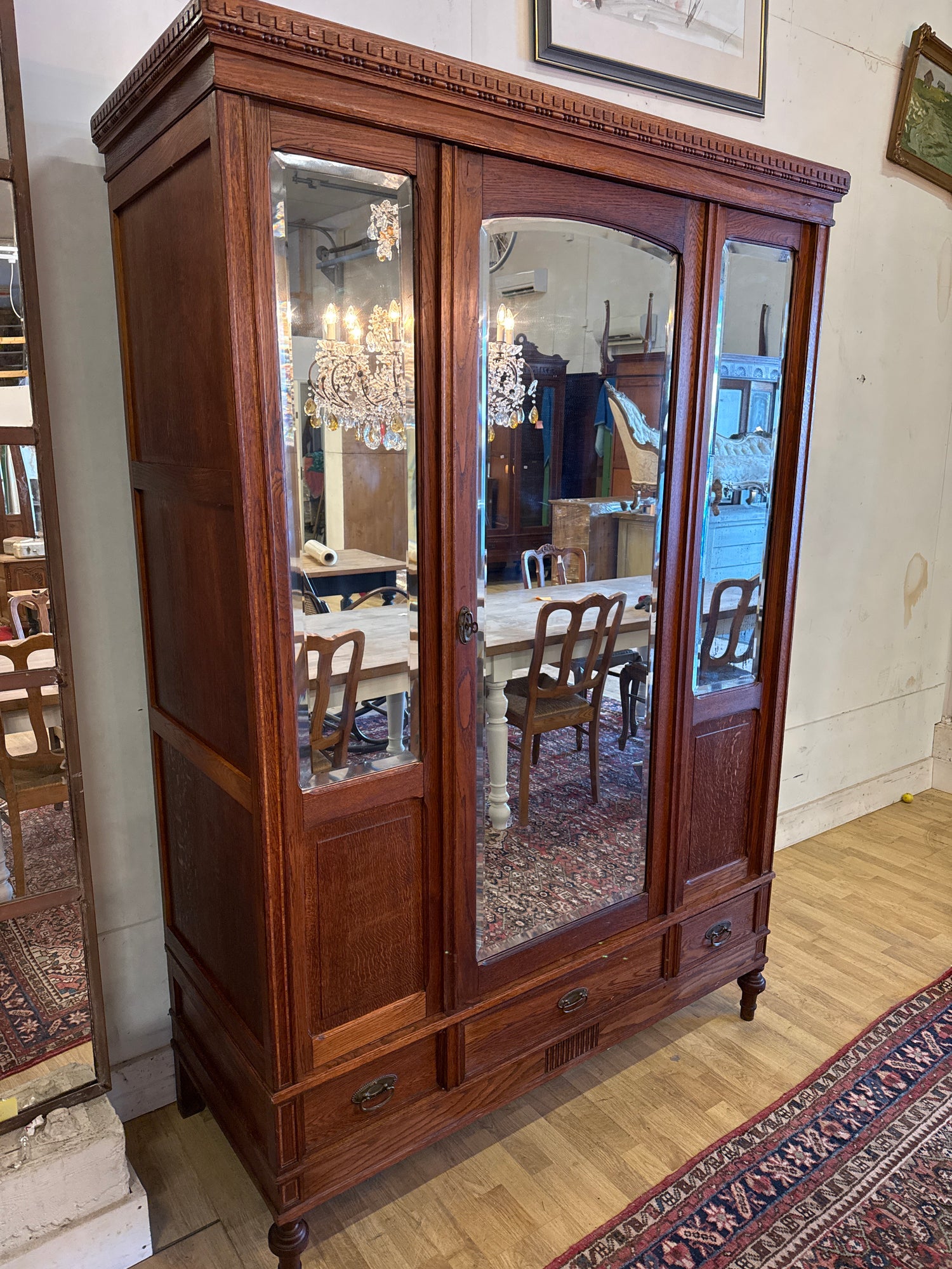 Kaappi menee osiin kuljetuksen ajaksi ja näin ollen se on helppo kuljettaa myös vähän ahtaampaakin paikkaan. Kaappi on siistikuntoinen, mutta siinä on ajantuomaa patinaa mitkä kuuluu asiaan.