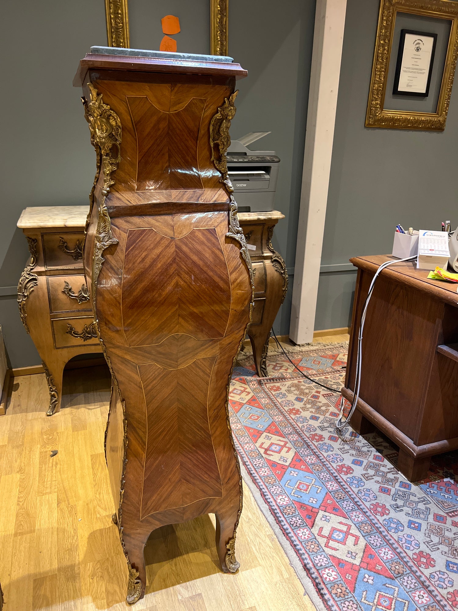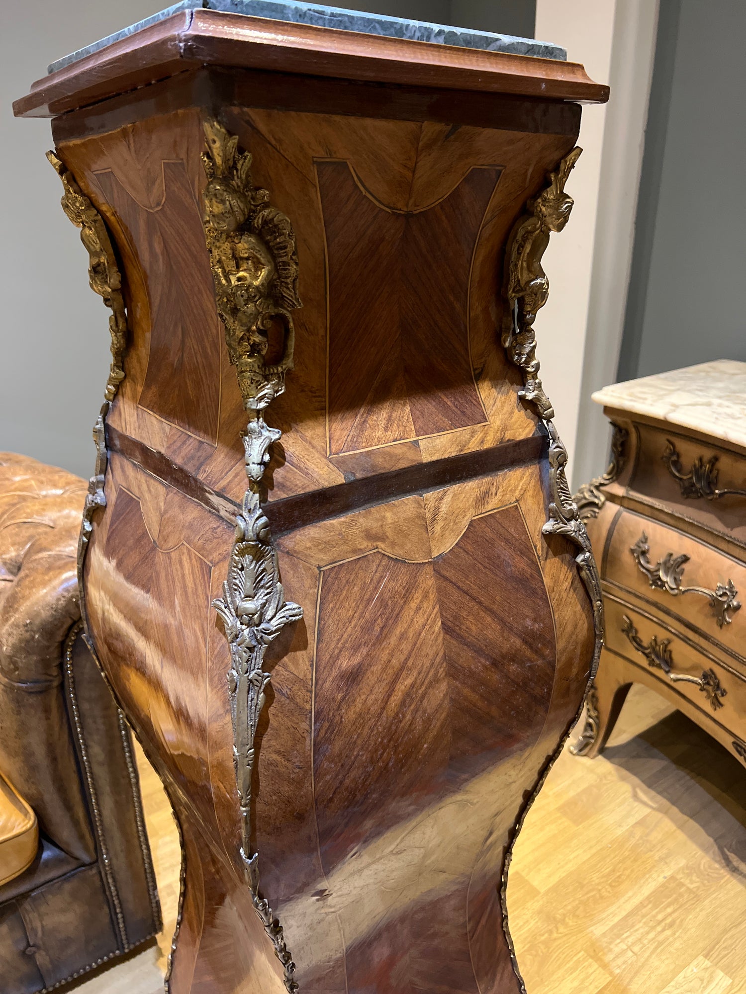 Todella upea pylväs kukalle, patsaalle tai ihan vaan näin koristeeksi😍 Upeaa italialaista intarsia puutyötä, pronssi ja marmoria. Kansi pyöväässä marmosia ja koristeet pronssi/messinki. Pylväs on joka suunnasta viimeistelty ja saman näköinen, joten se on helppo sijoittaa vaikka keskelle tilaa.. Tästä katseen vangitsija joka ei jätä kylmäksi🥰