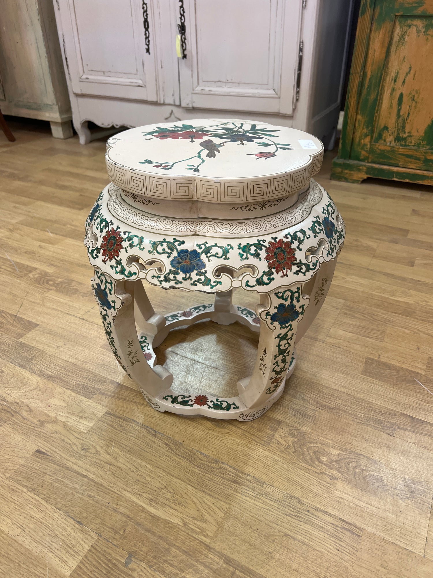 Kaunis ja tukeva kukkapöytä. Patinaa ja kulumaakin on tarttunut vuosien saatossa. Hieno sisustusesine kasvin alle tai vaikka lisä jakkaraksi.