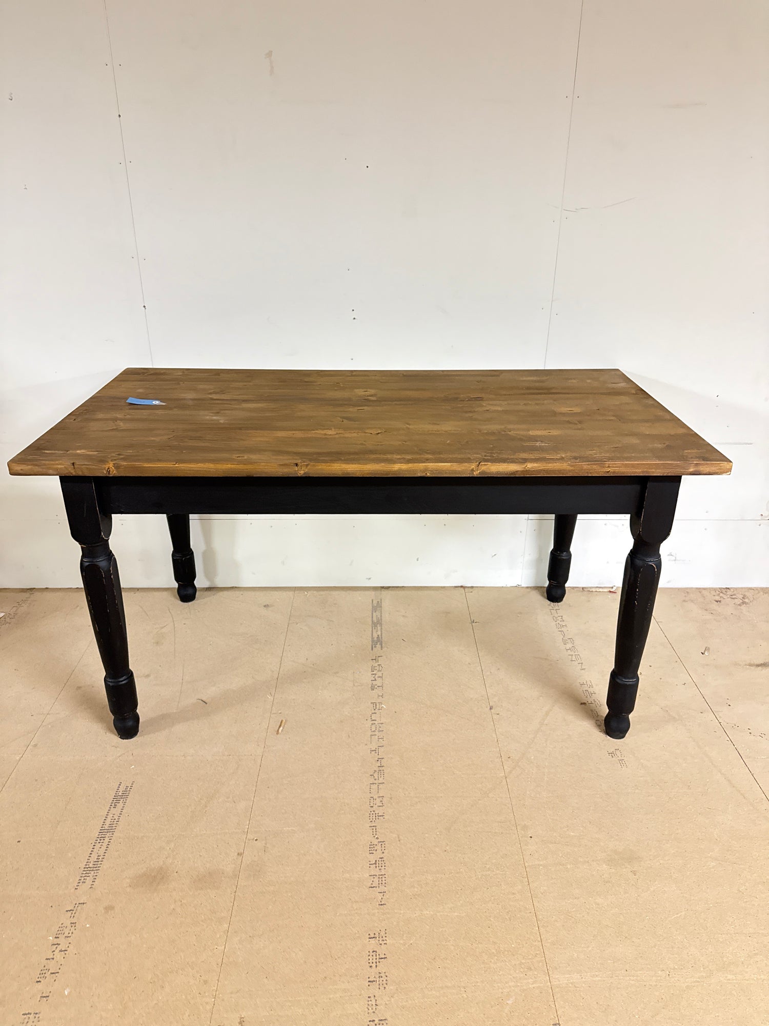 Upea mustajalkainen talonpoikaispöytä, jossa kauniisti patinoitunut jalkaosa. Kansi mäntyä joka on vaihdettu jossain vaiheessa. Sopii erinomaisesti vaikka kirjoituspöydäksi, ruokapöydän lisäksi.