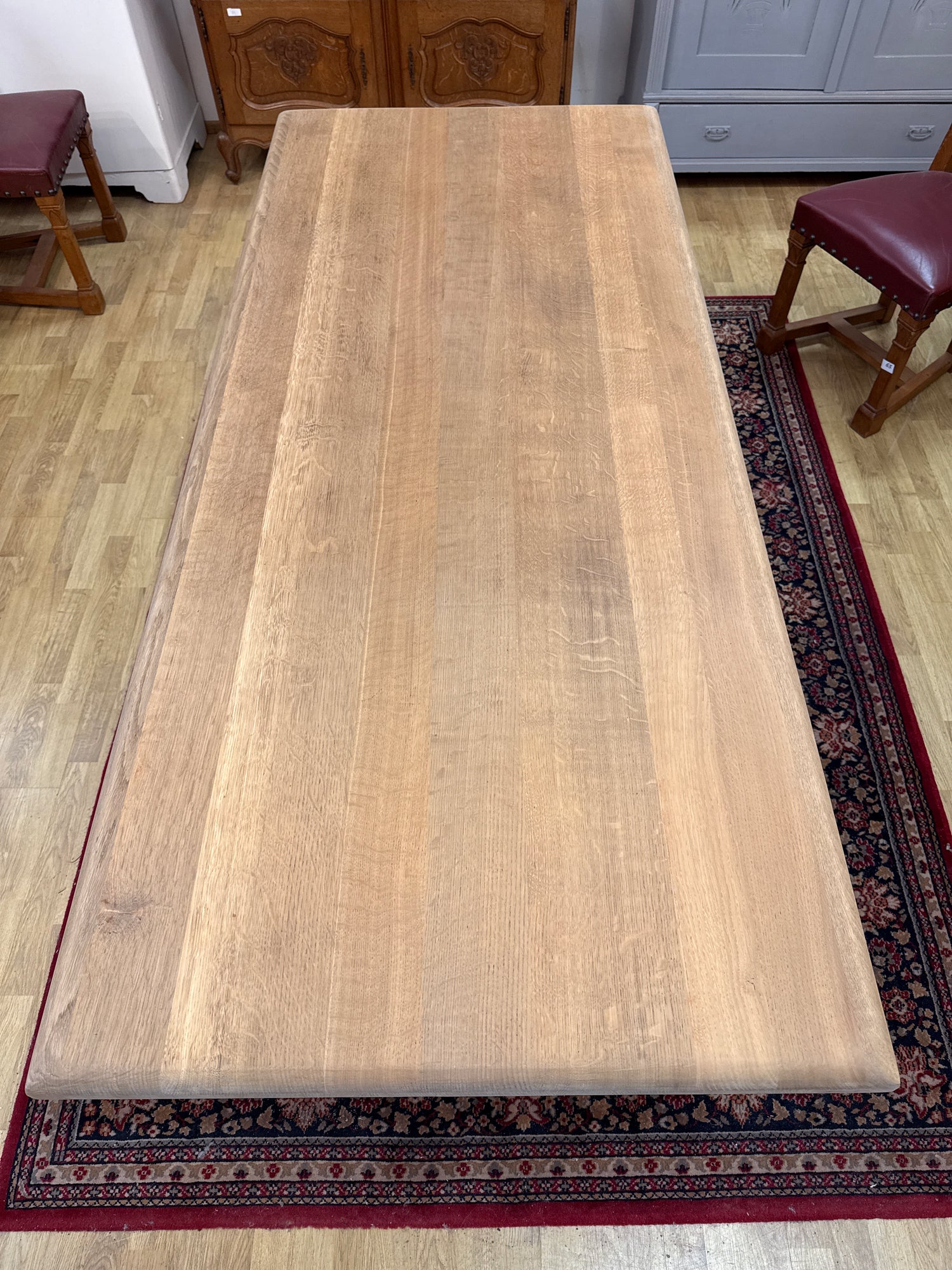 Huikea käsittelemätön tammipöytä joka kestää vähän kovempaakin nojailua. Painava ja tukeva pöytä on myös erittäin hyvä lapsiperheissä, missä pöydät saa kolhuja enemmän, vanhan tammen kova pinta pysyy hyvin siistinä ilman suurempia lommoja.