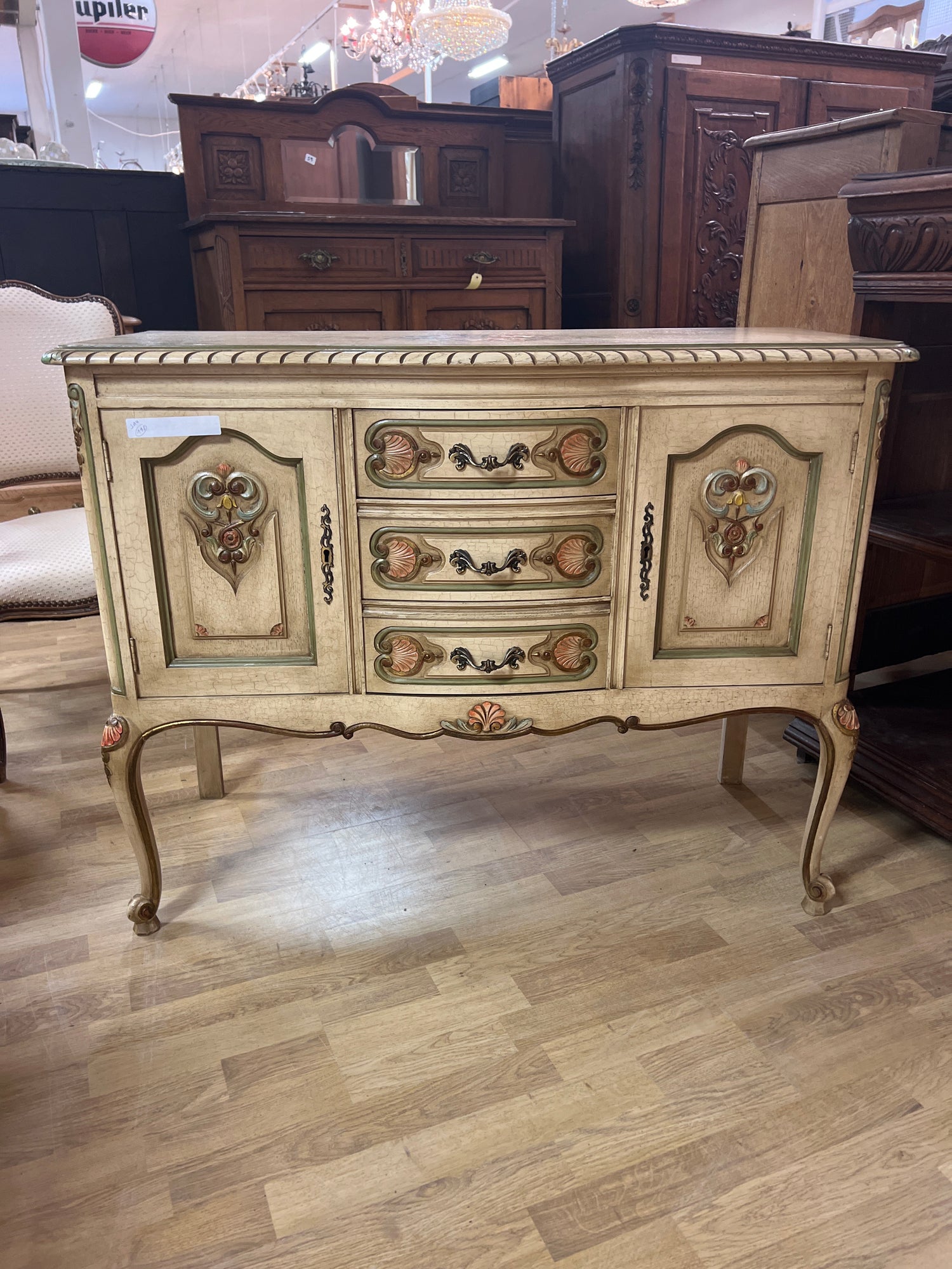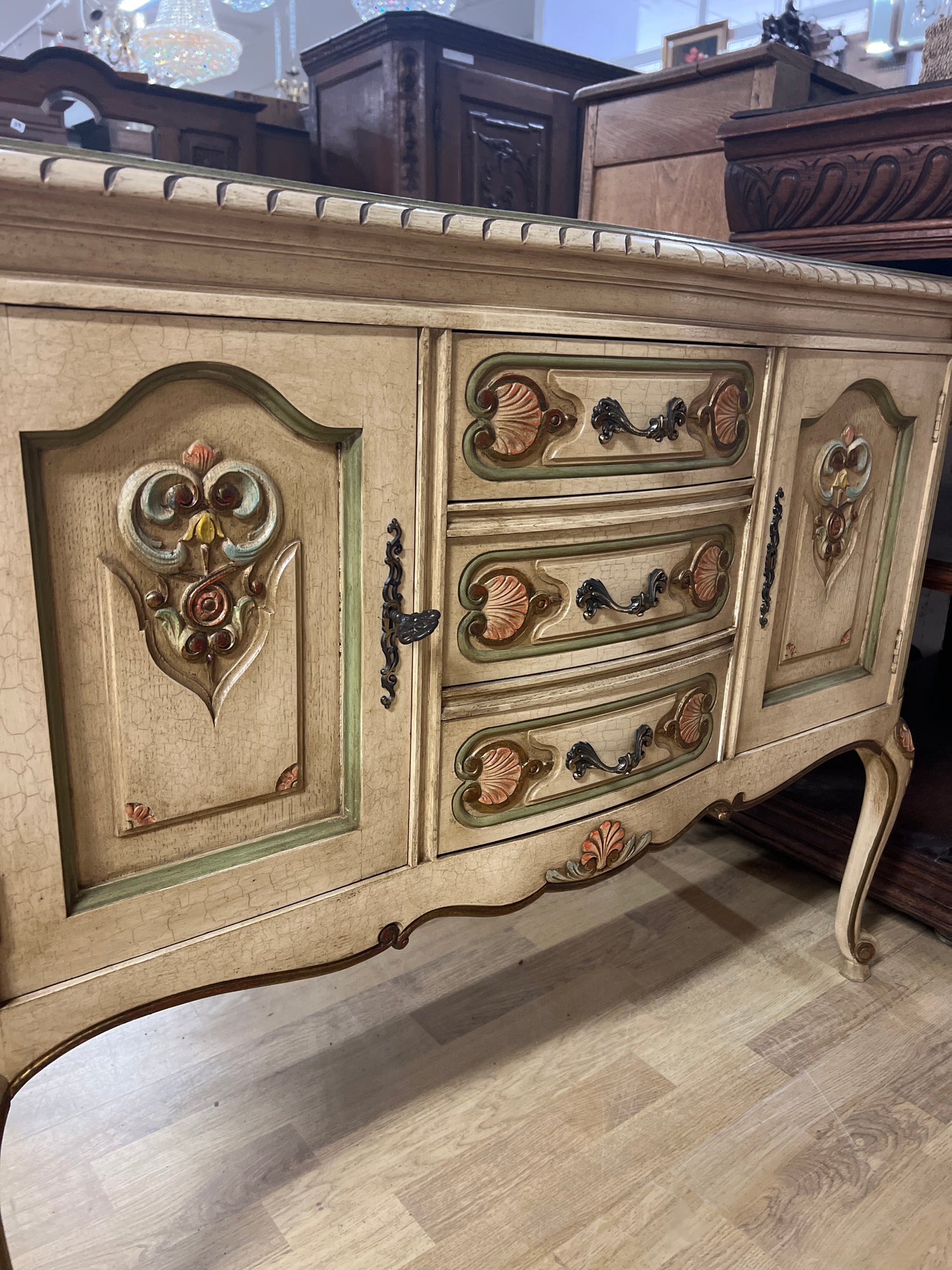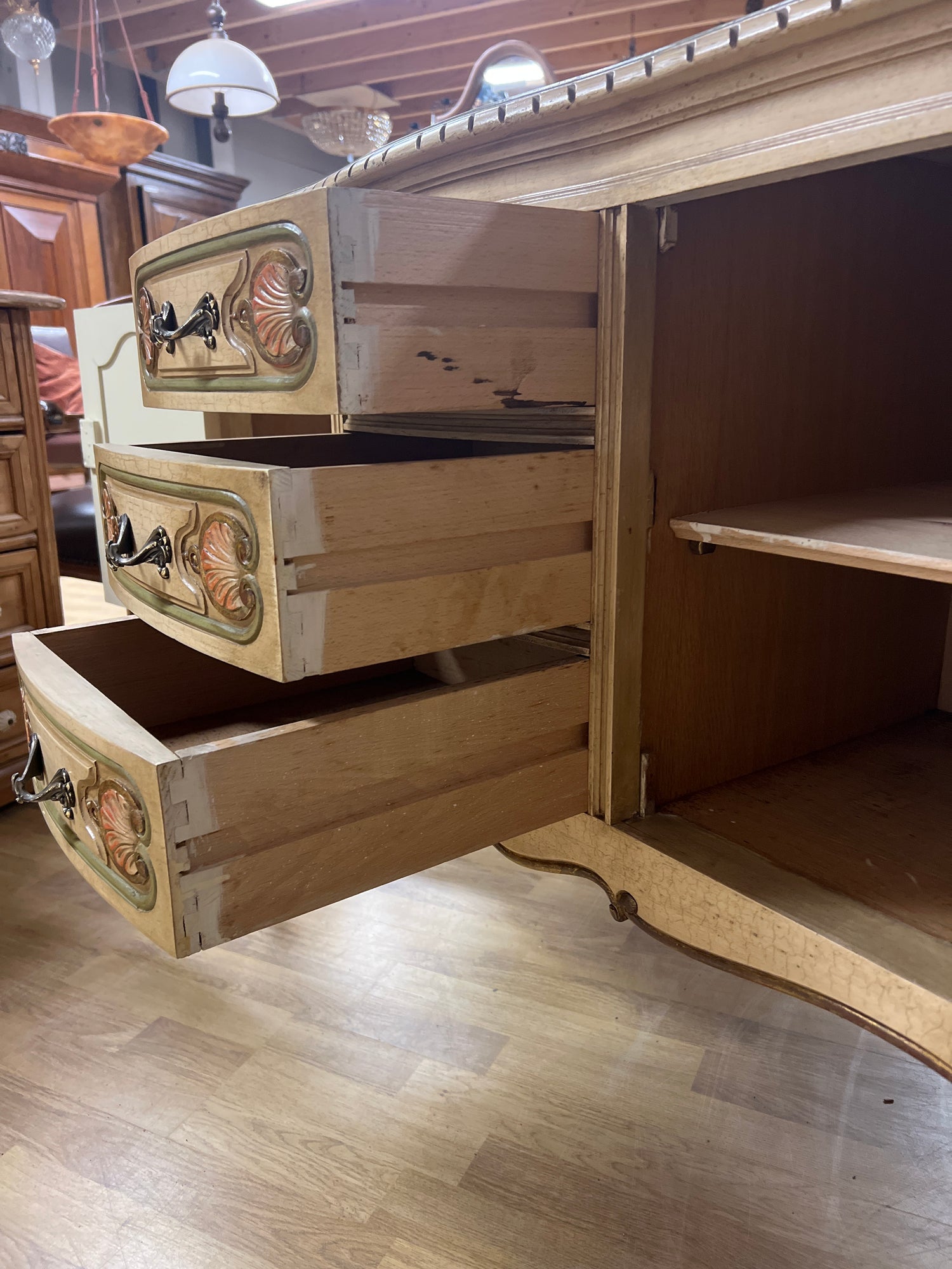 Kaunis vaalea rokokoo senkki kauniilla koriste maalauksilla. Pinta krakeloitu hienosti😍 Kaikki toimii todella hienosti, laatikot luistaa ja lukot toimii. Avain tallessa. Tästä suoraan käyttöön, vaikka tv:n alle. Senkissä voi näkyä iän tuomaa patinaa ja kulumaa.