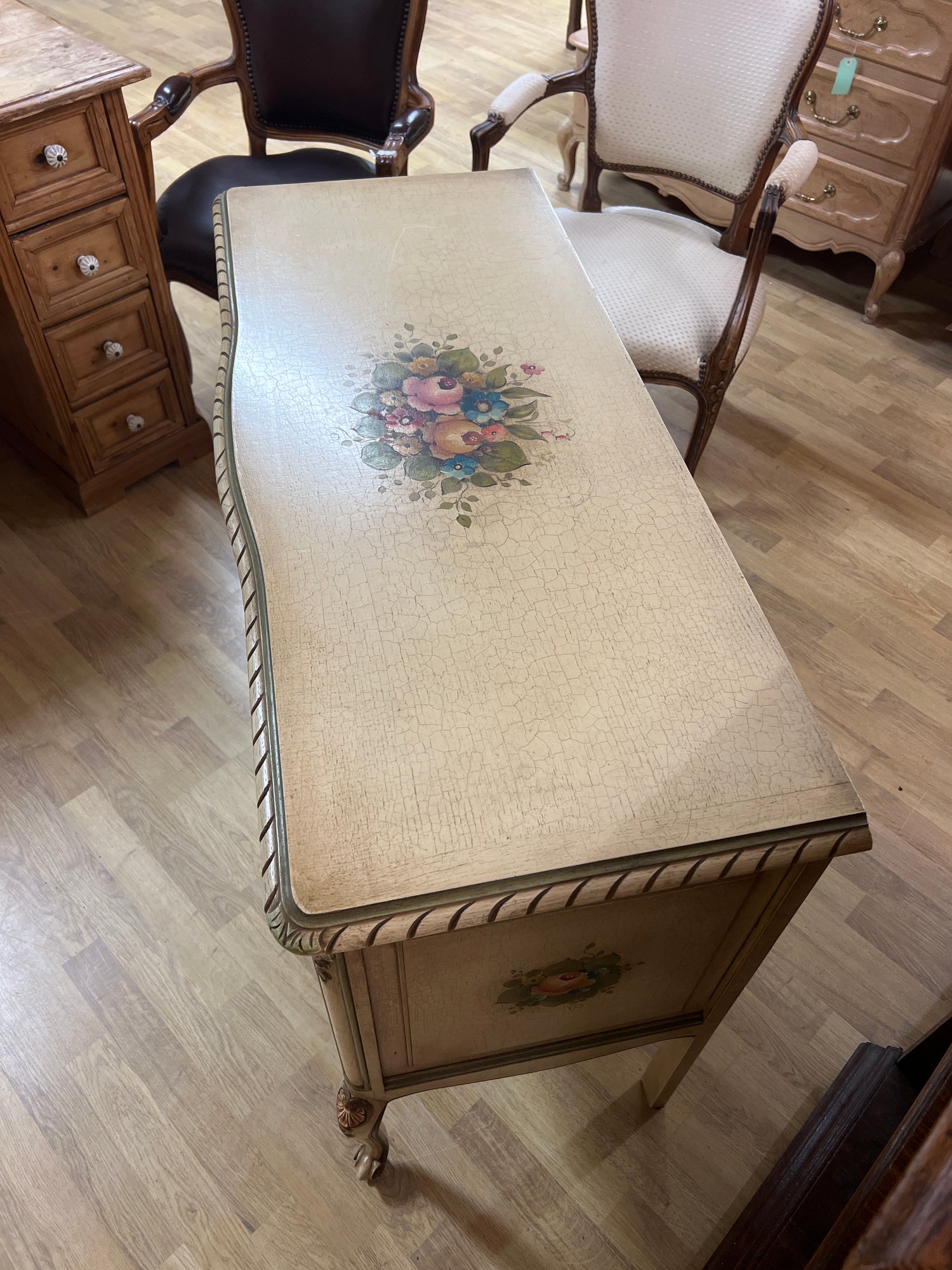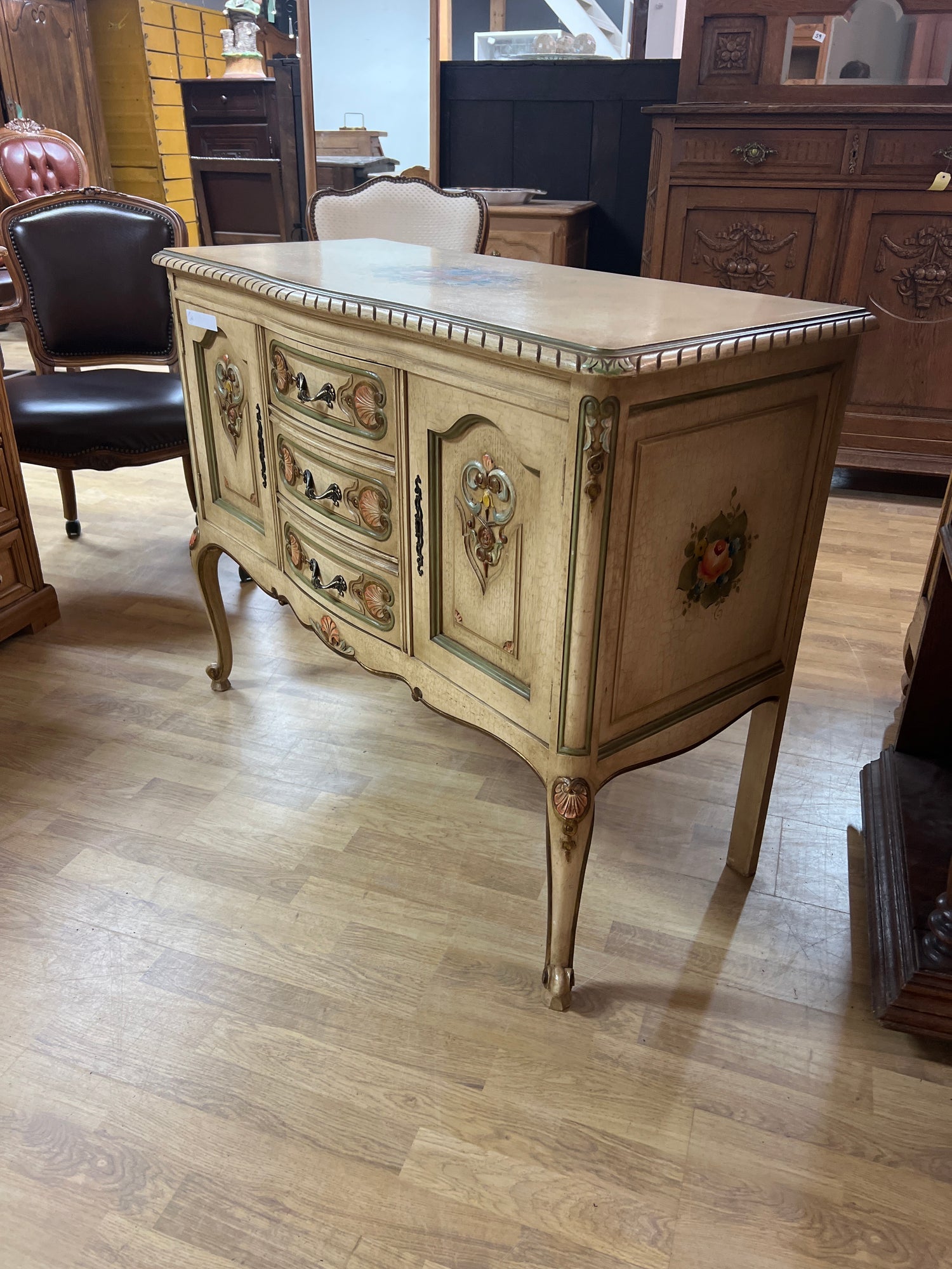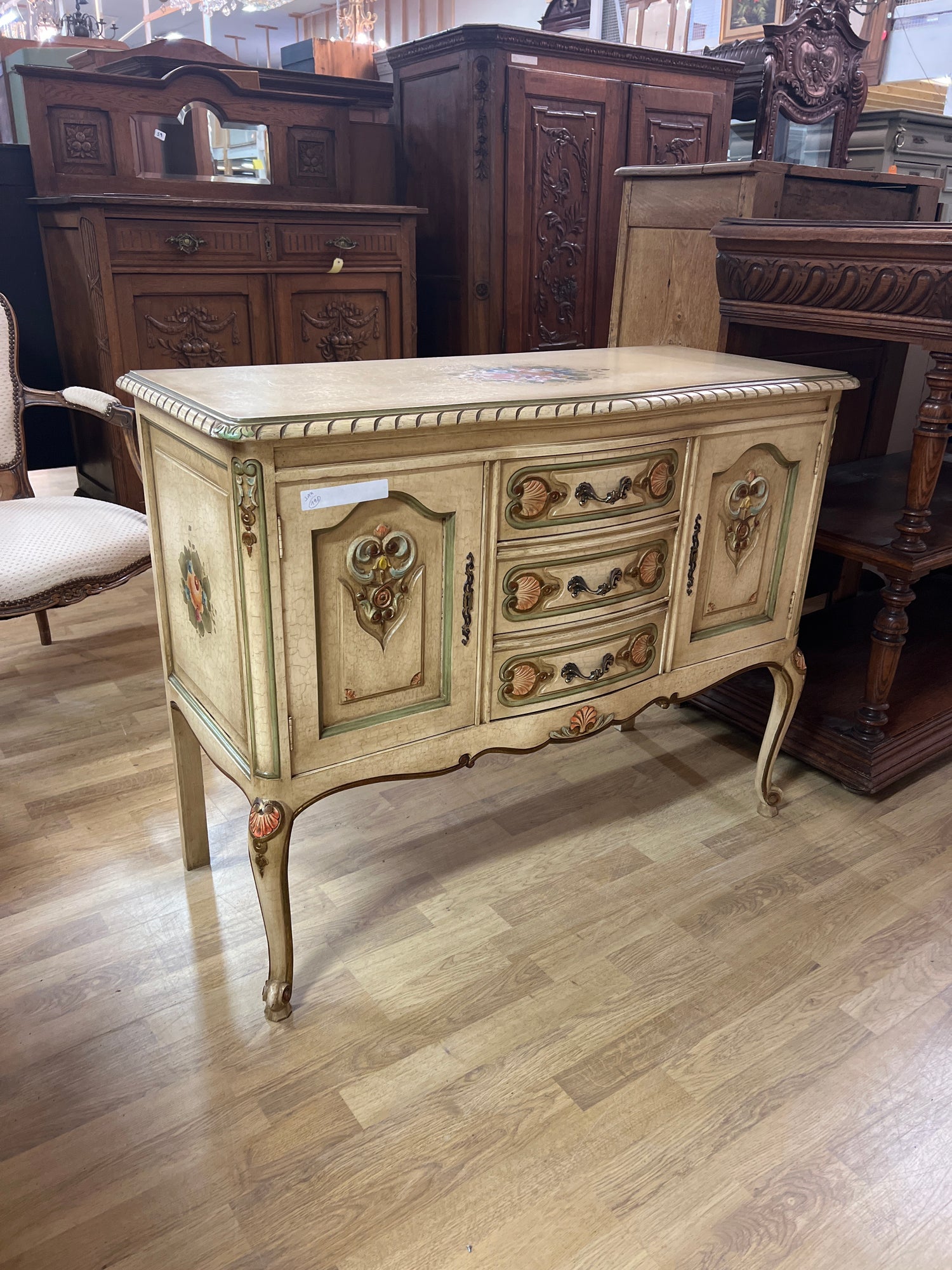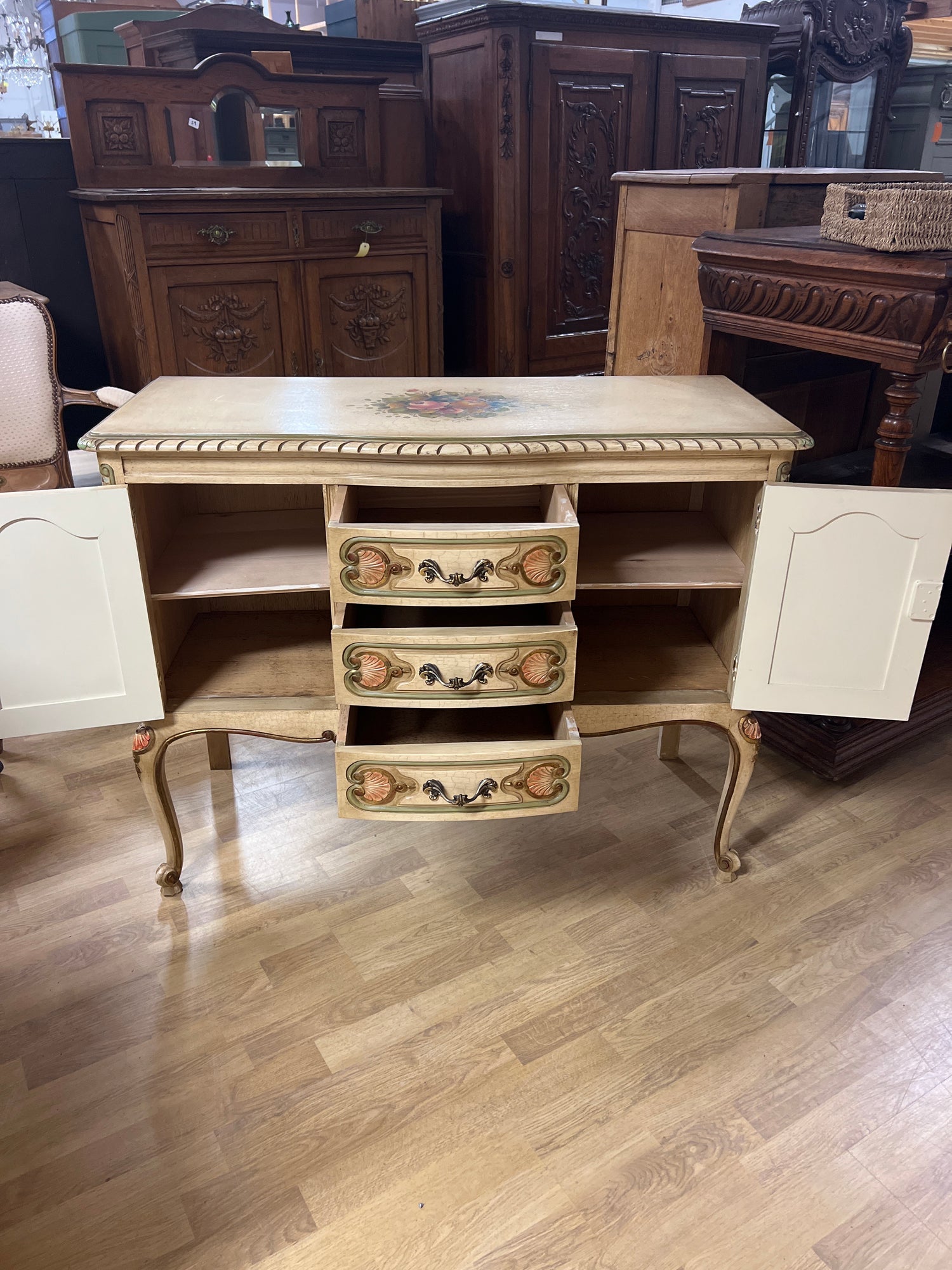 Kaunis vaalea rokokoo senkki kauniilla koriste maalauksilla. Pinta krakeloitu hienosti😍 Kaikki toimii todella hienosti, laatikot luistaa ja lukot toimii. Avain tallessa. Tästä suoraan käyttöön, vaikka tv:n alle. Senkissä voi näkyä iän tuomaa patinaa ja kulumaa.