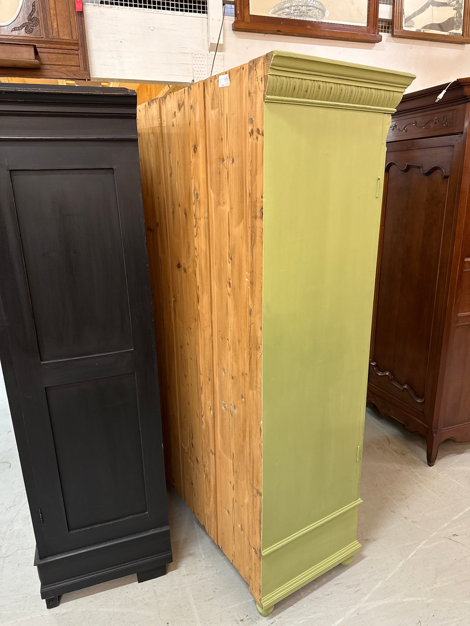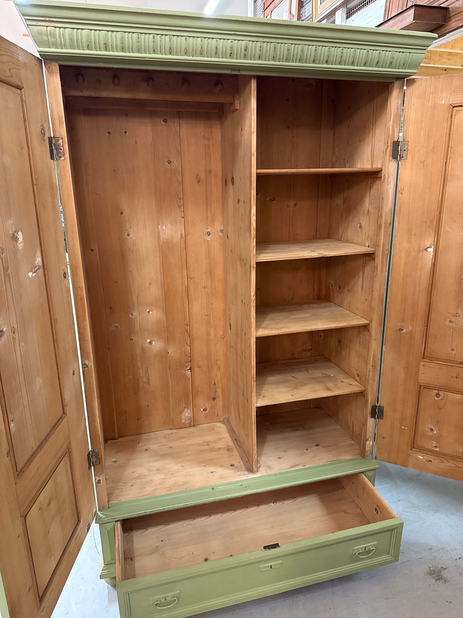 Upea oliivinvihreä vaatekaappi jossa toisella puolella hyllyt ja toisella puolella naulakko. Kaappi on hajuton, siisti ja suoraan käyttöön valmis. Unkarista tullut kaappi on 1920-30 luvulta.