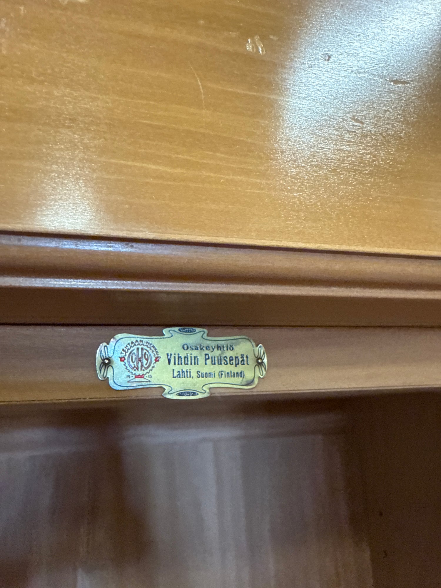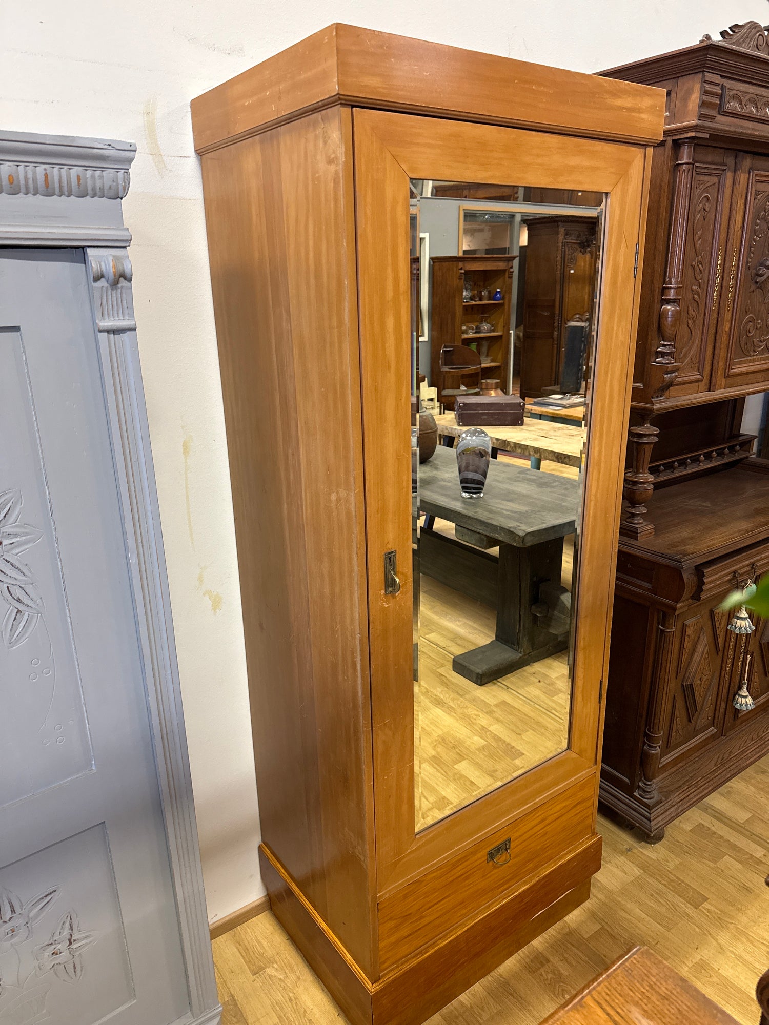 Huikea kotimainen puusta tehty vaatekaappi. Hienossa kunnossa oleva fasettihiottu peili. Kaapissa on näkyvissä pientä patinaa, mutta ne häviää helposti kevyellä öljyämisellä, mikä me voidaan tehdä jos niin tahtoo.