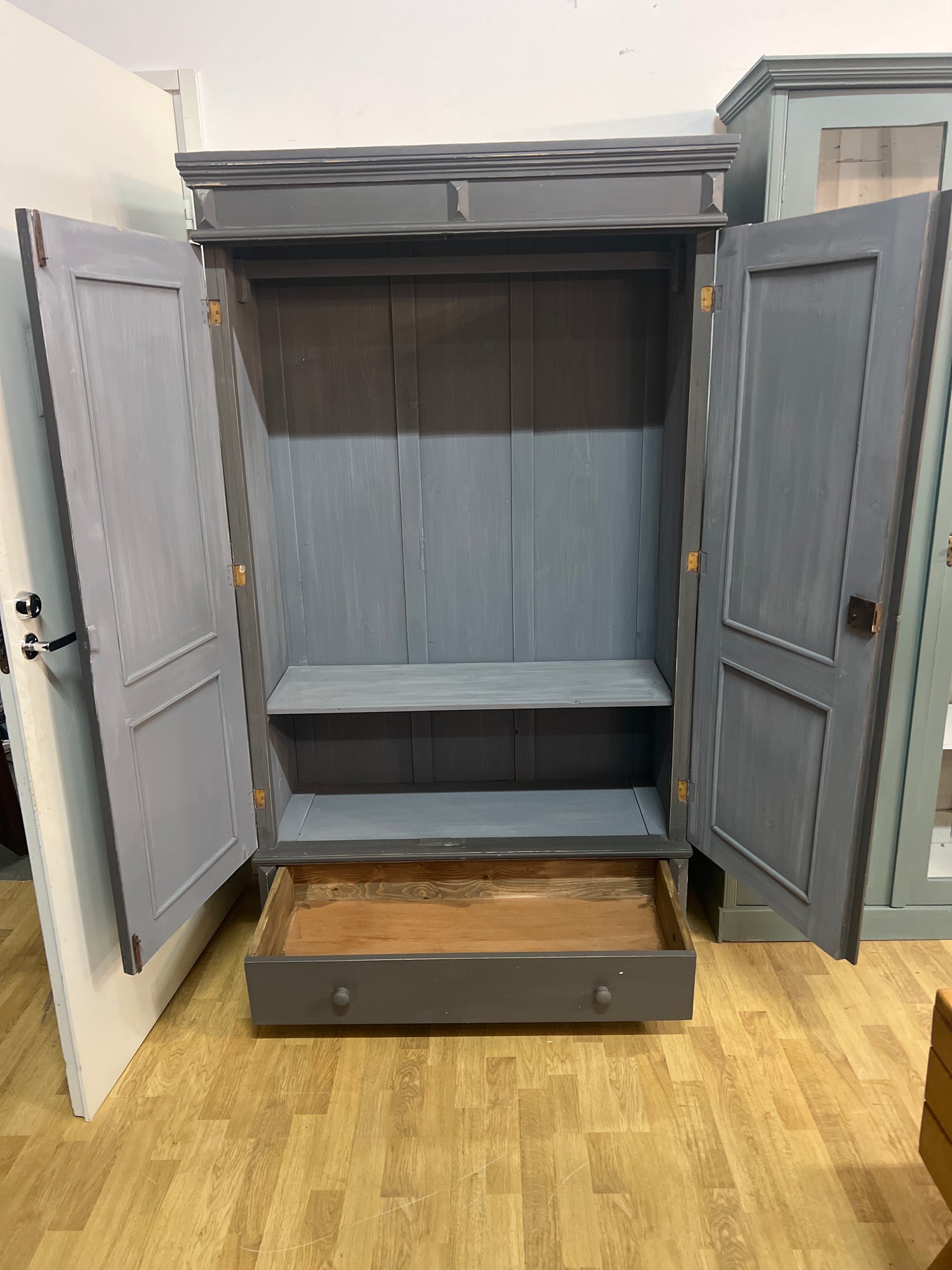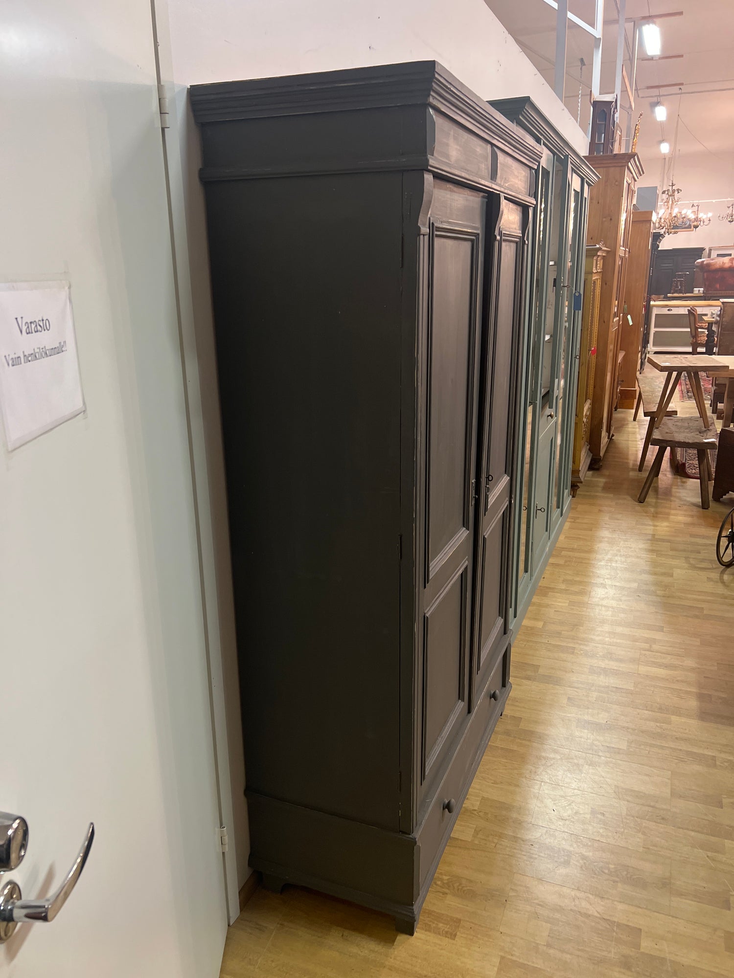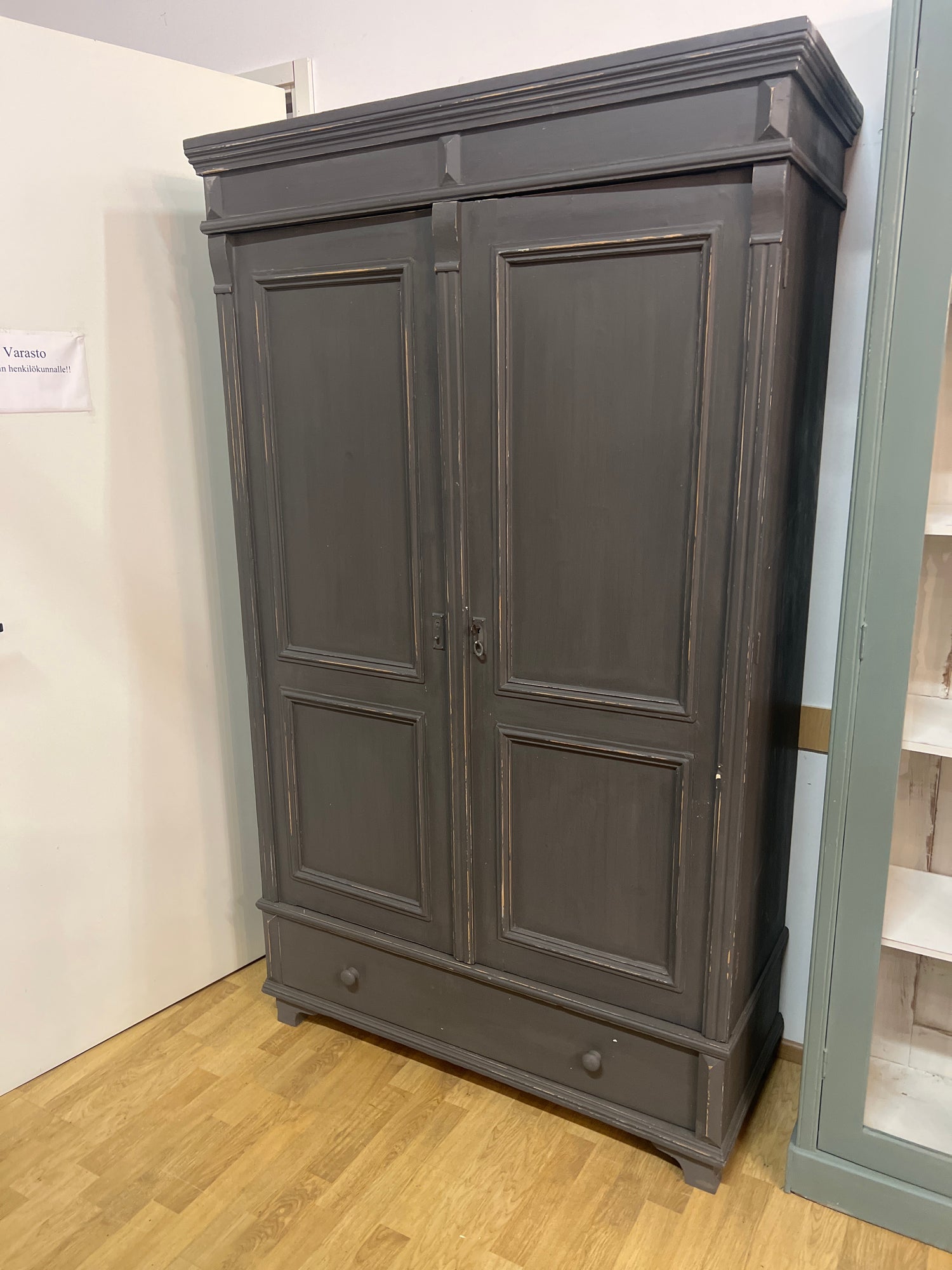 Yksinkertaisen tyylikäs harmaa vaatekaappi 1920-luvun unkarista. Kaappi toimii hienosti, niinkuin kuuluukin. Tukeva, jämäkkä ja suoraan käyttöön valmis. Kaapissa on iän tuomaa patinaa ja kulumaa.