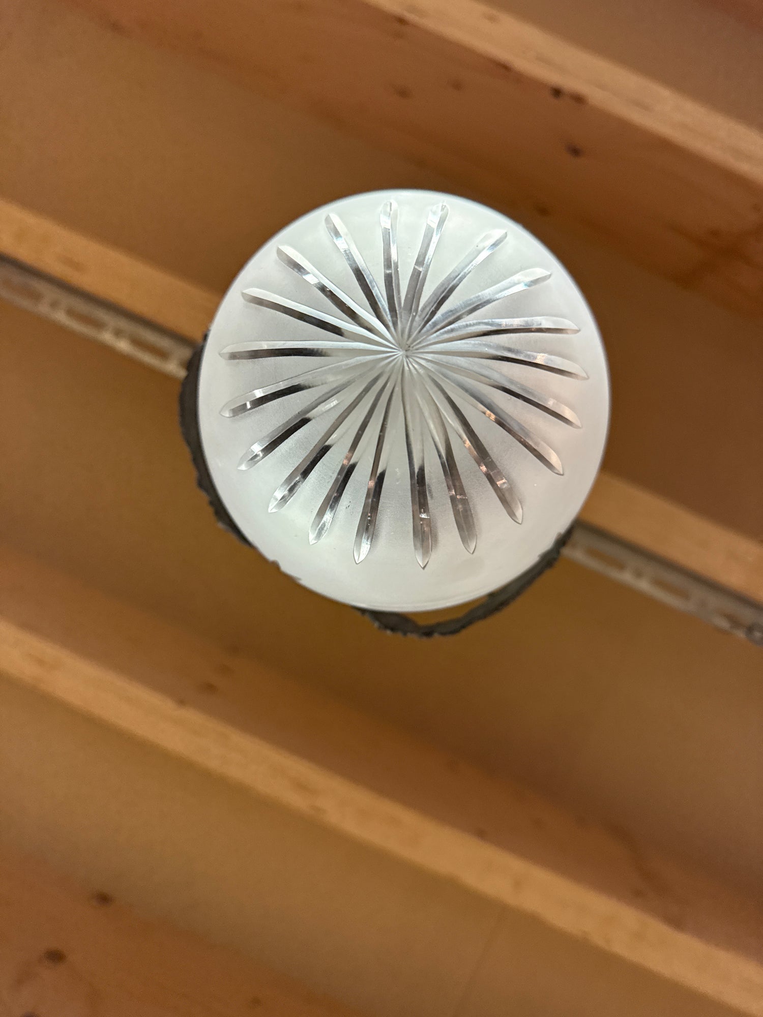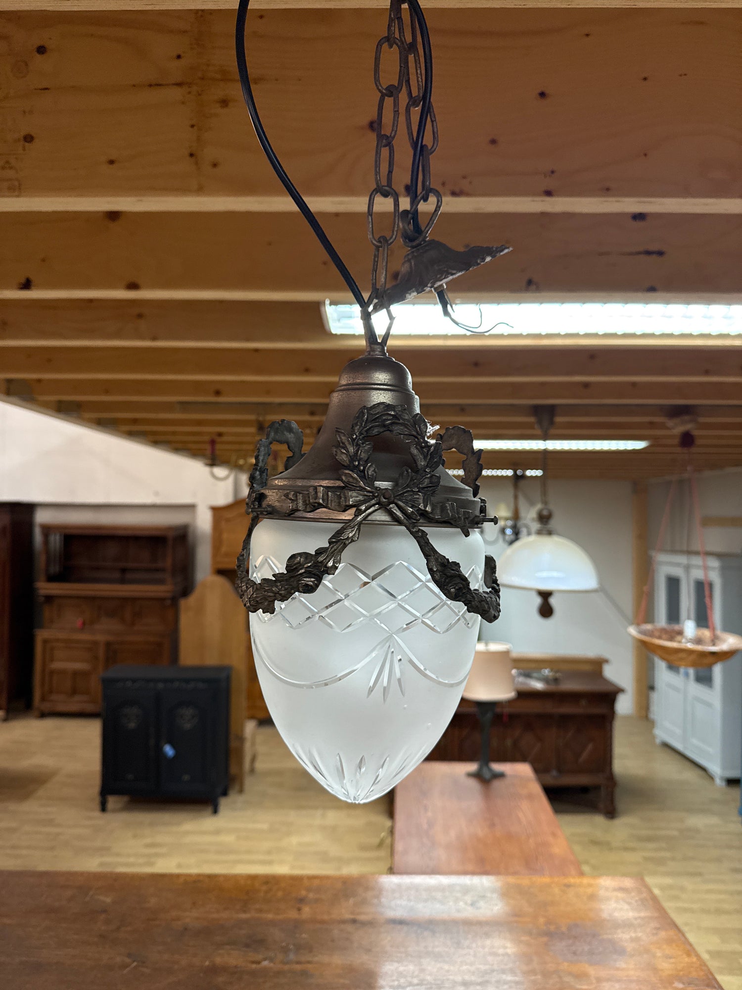 Kaunis empire valaisin jossa lasikupu ehjä ja kauniisti hiottu. Valaisin toimii ja on tarkastettu ja sähköjohto vaihdettu. Upea patinoitunut tinan värinen runko.
