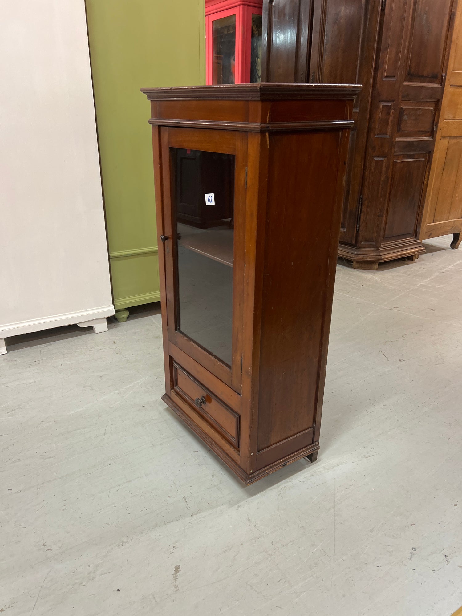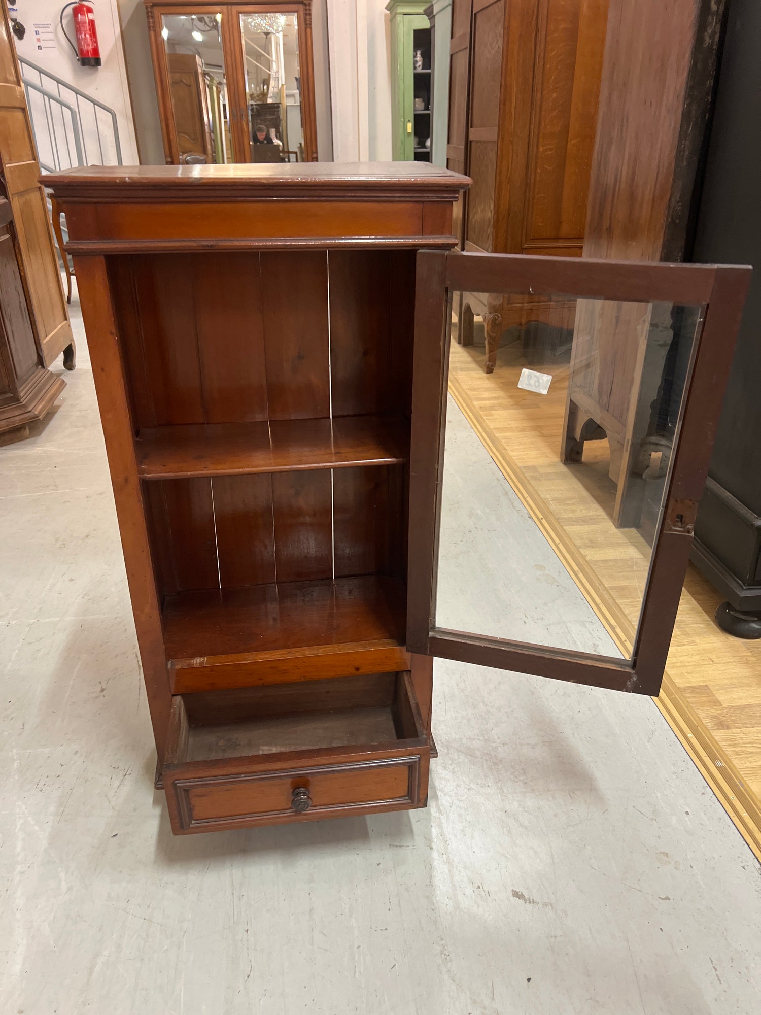 Kaunis mahonkinen mini kokoinen vitriinikaappi. Toimii hienosti, niinkuin pitääkin. Vitriinissä iän tuomaa patinaa ja kulumaa havaittavissa.