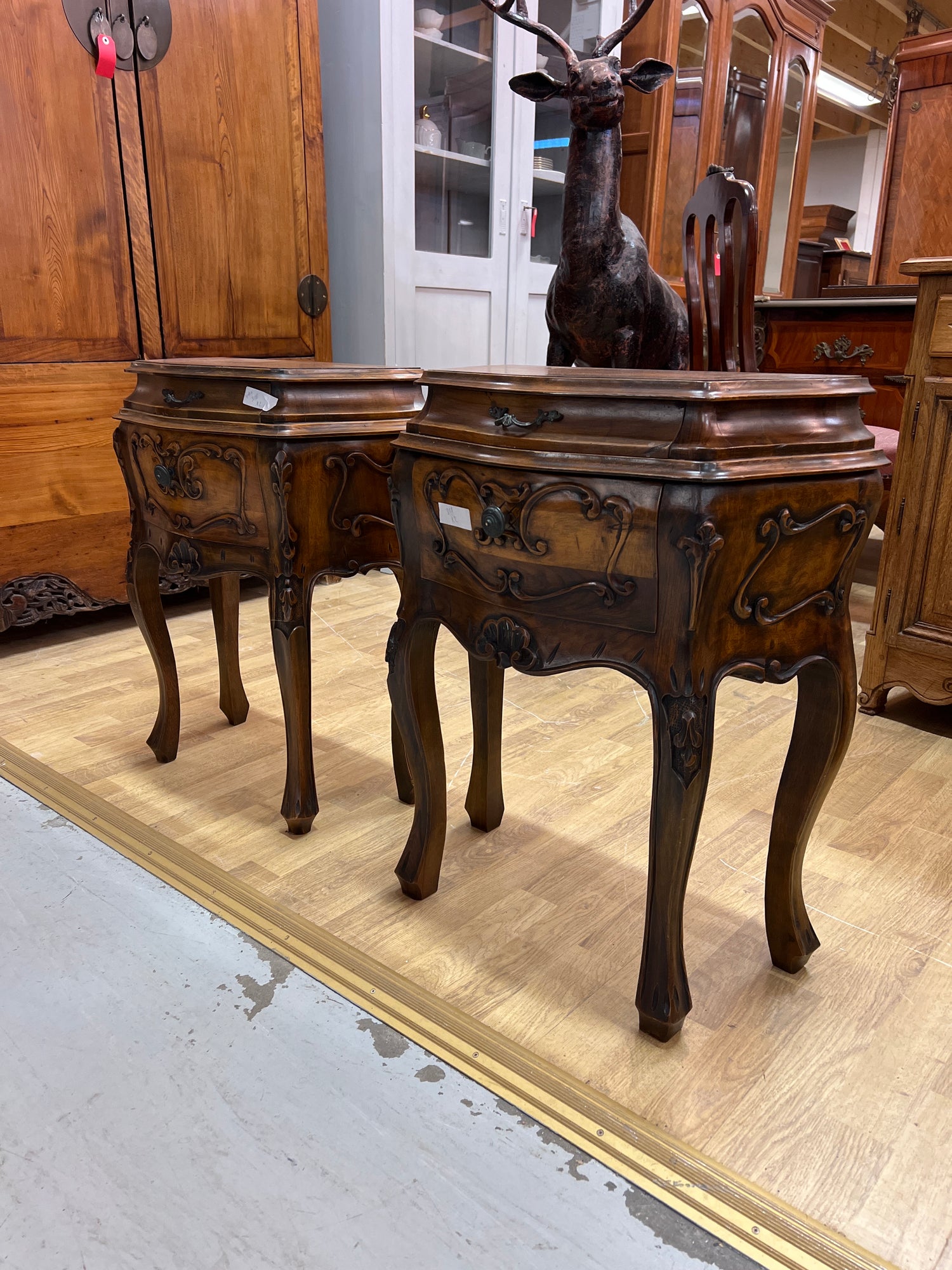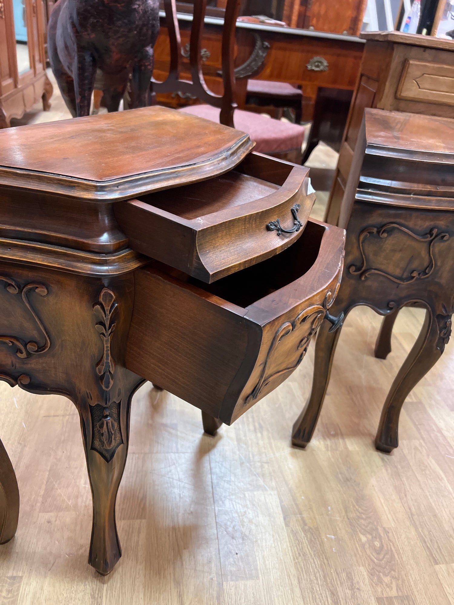 Todella kauniit käsiveistetyt mahonkiset yöpöydät vetolaatikoilla. Tästä nopeimmalle upea yöpöytäpari