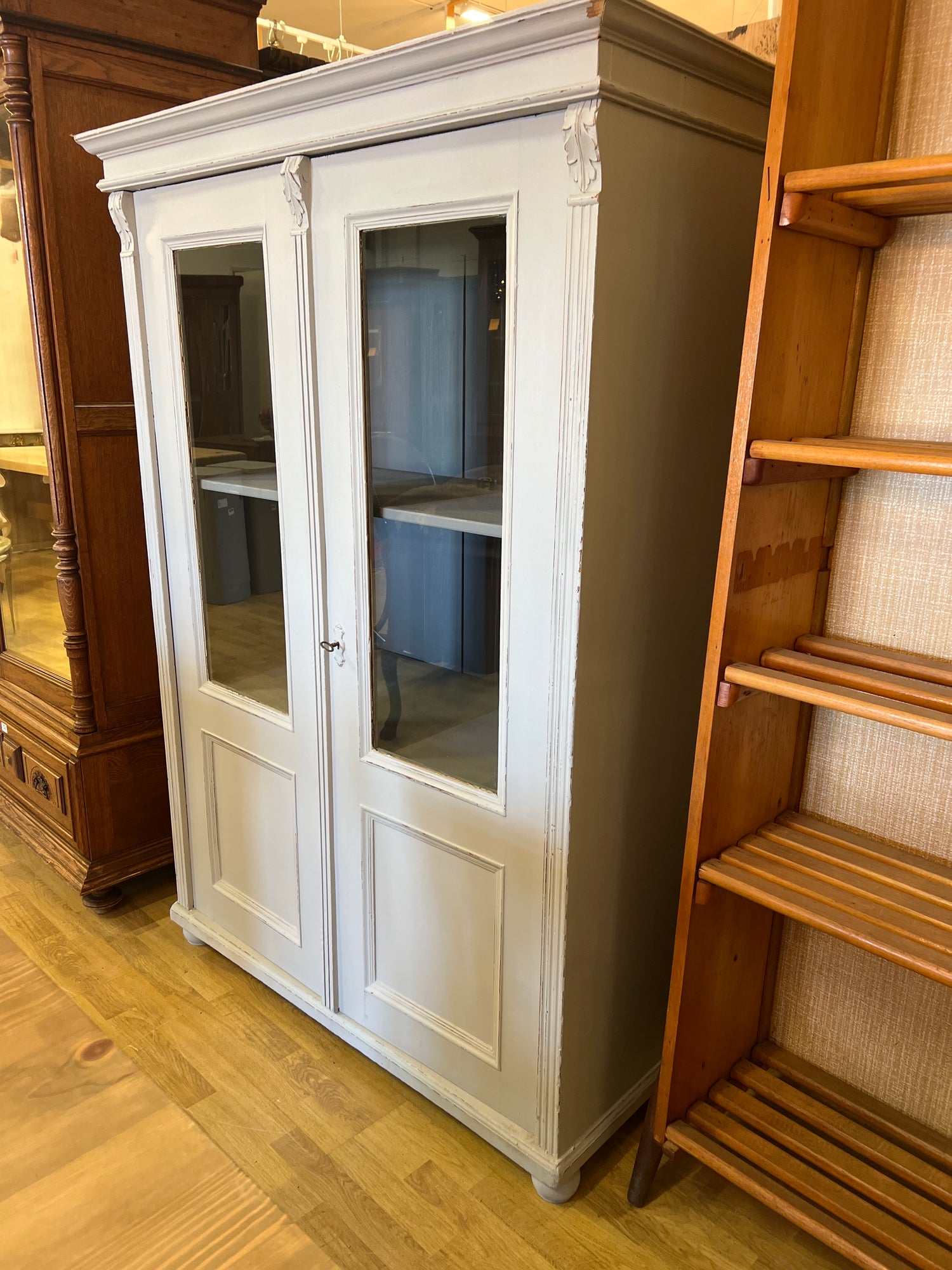 Kaunis vaalean harmaa vitriinikaappi L. 123cm, S. 57cm ja K. 179cm