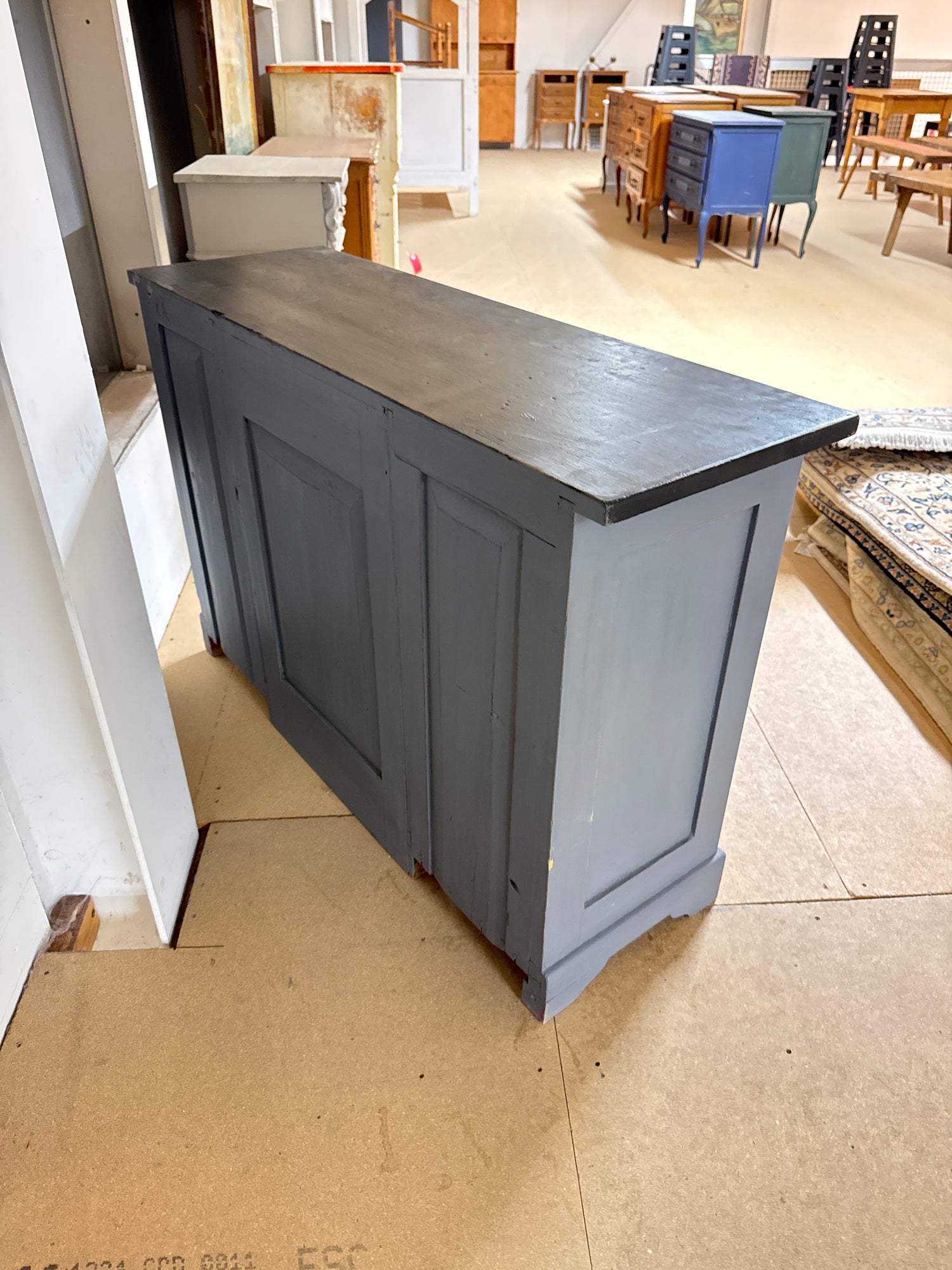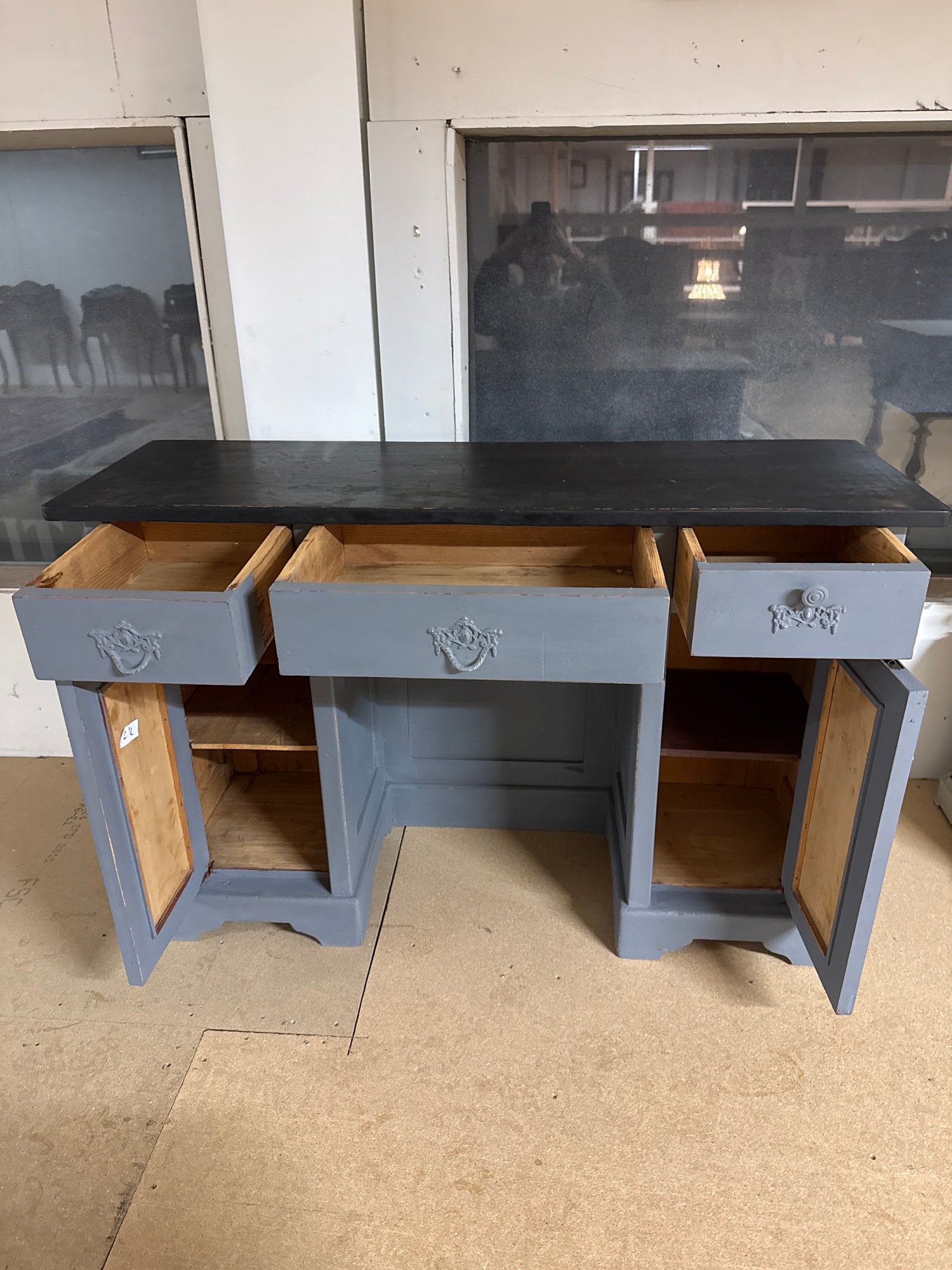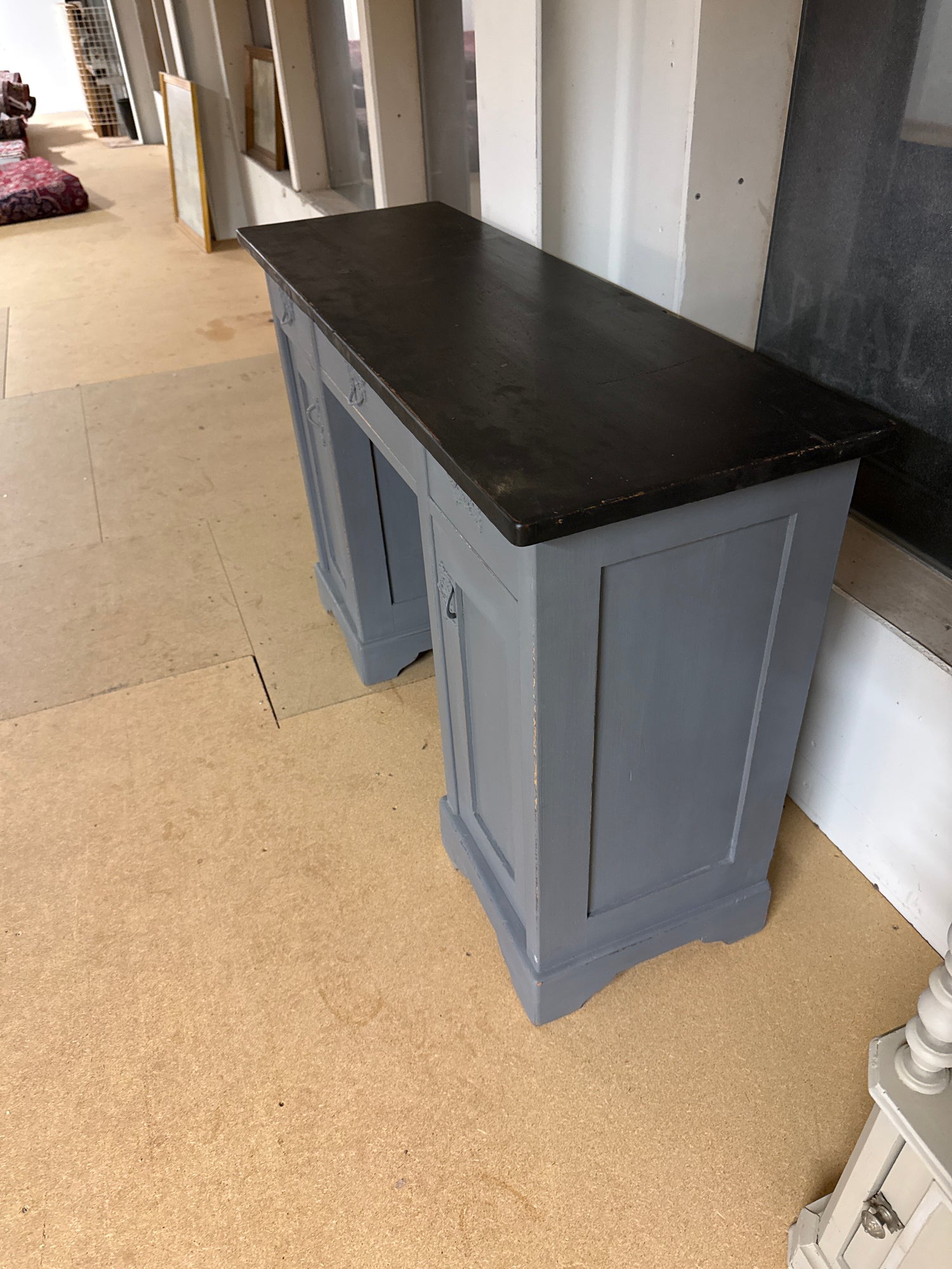 Kaunis harmaa kirjoituspöytä mustalla kannella.
