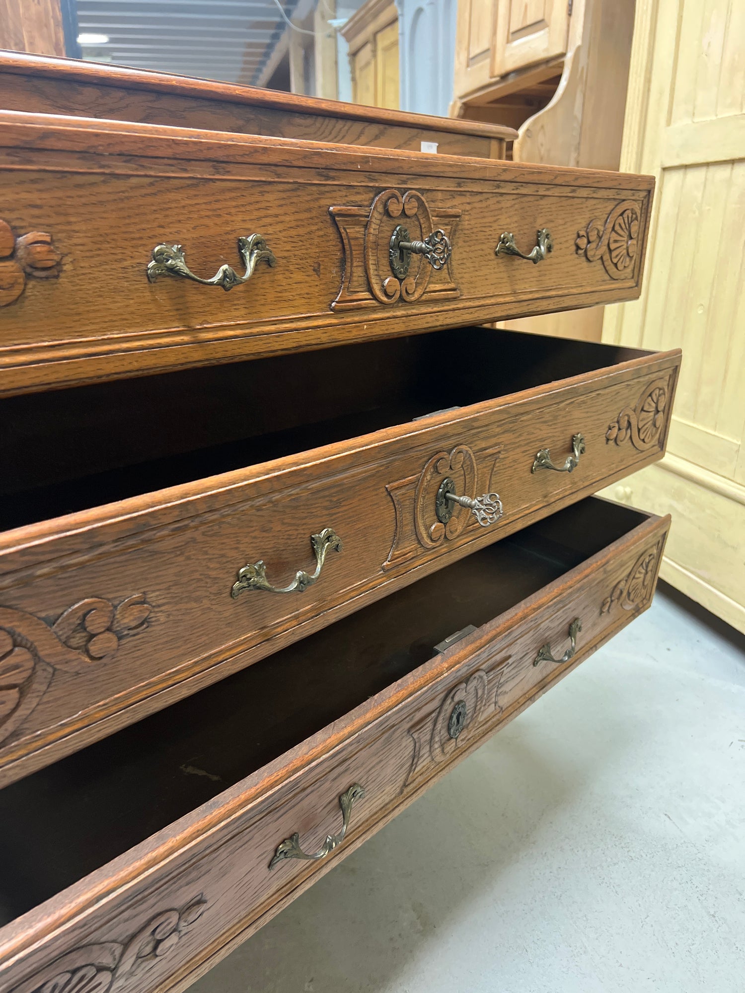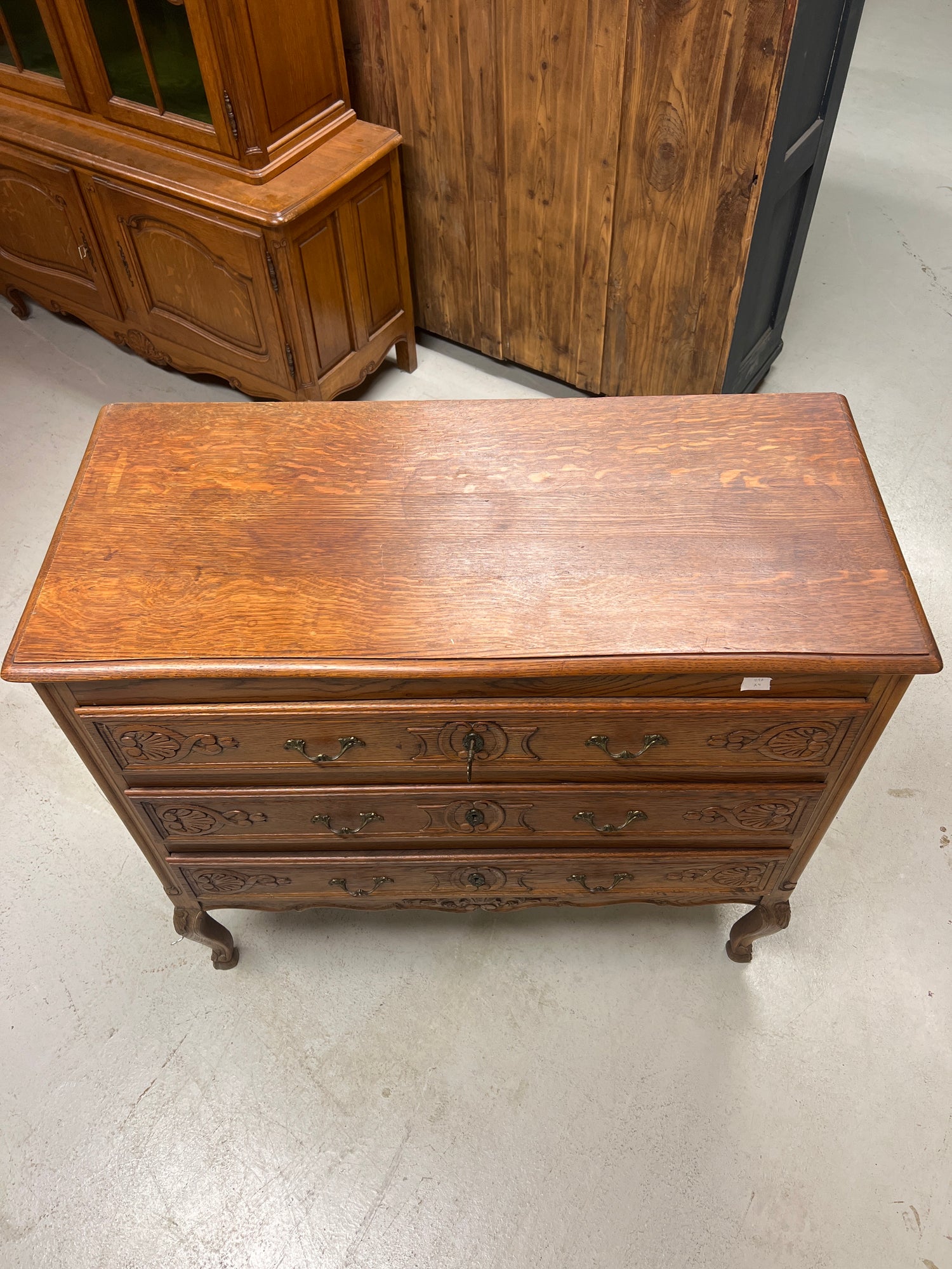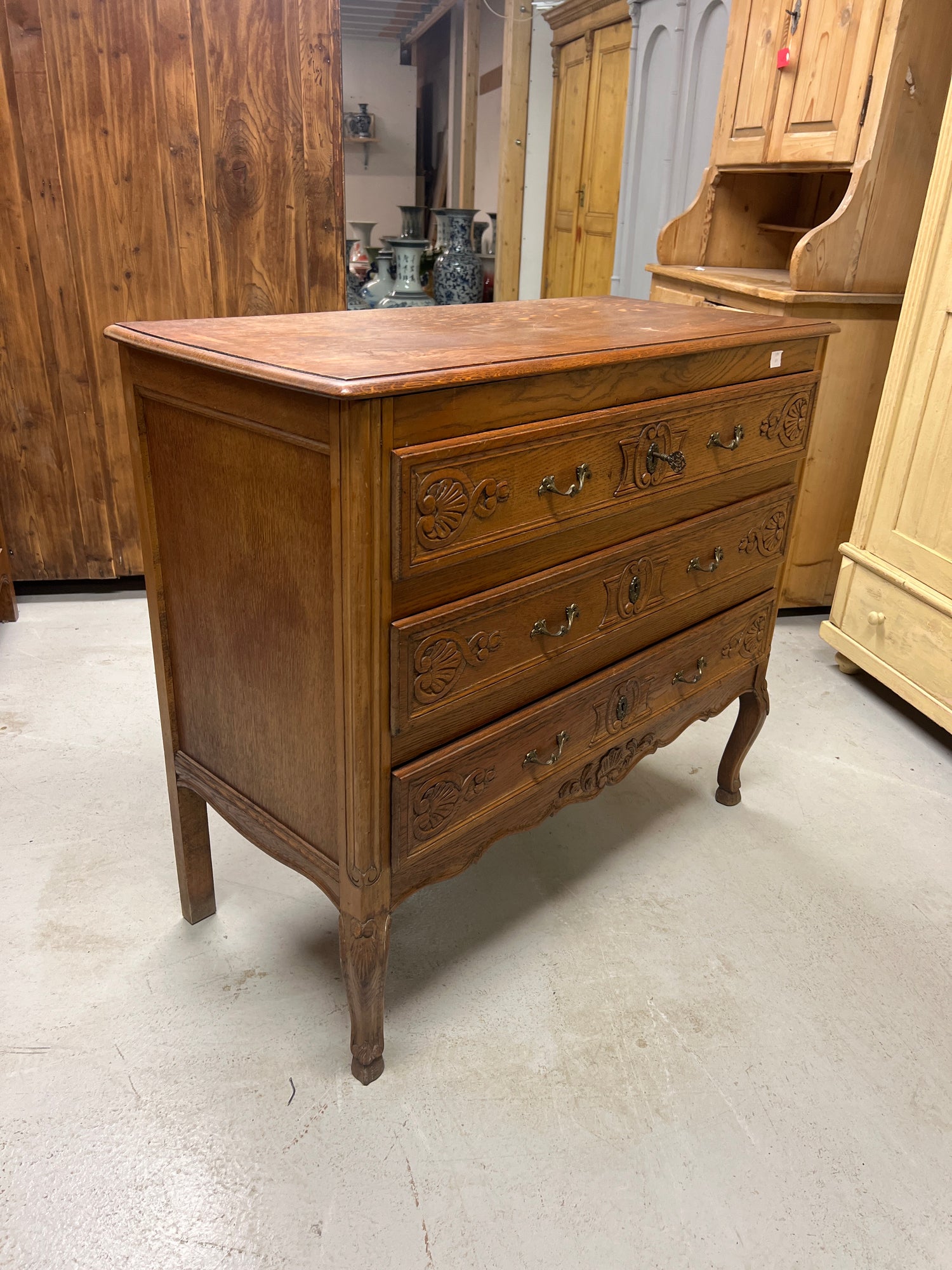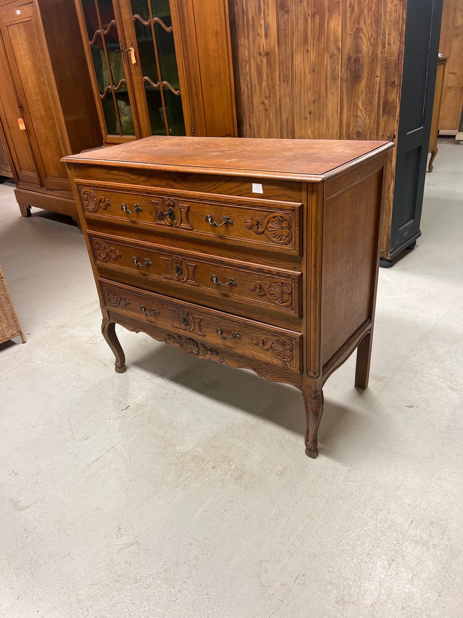 Kaunis rokokoo lipasto kolmella hyvin liikkuvalla vetolaatikolla. Kauniisti patinoitunut tammi lipasto. Tukeva, jämäkkä ja hyväkuntoinen😍