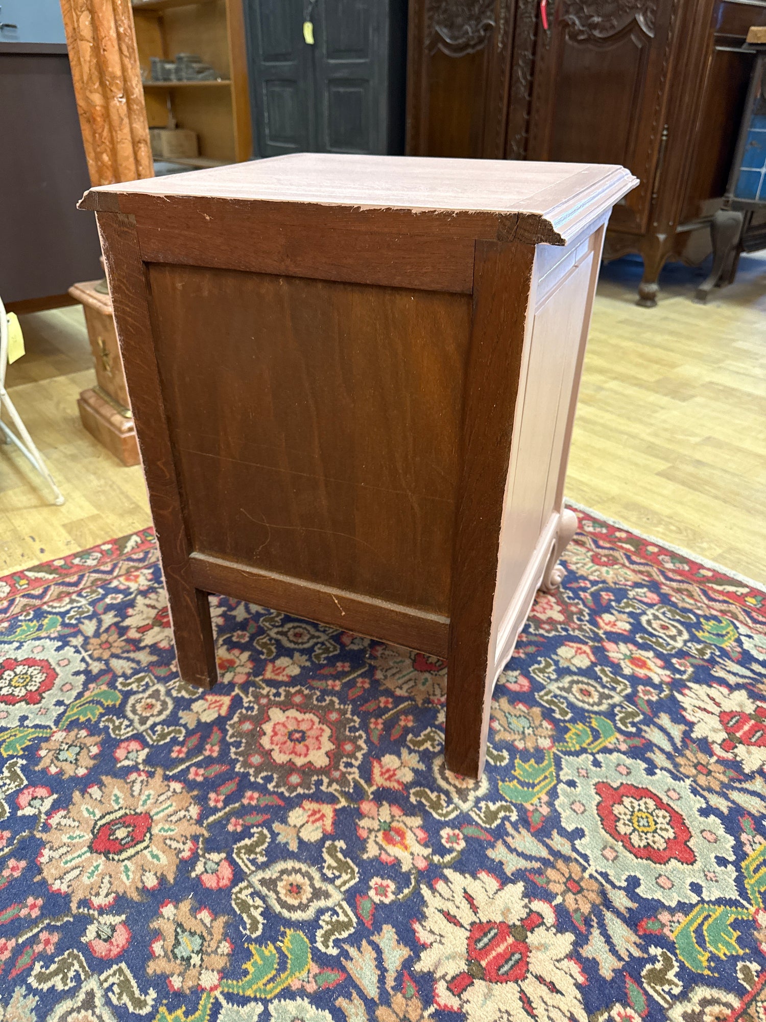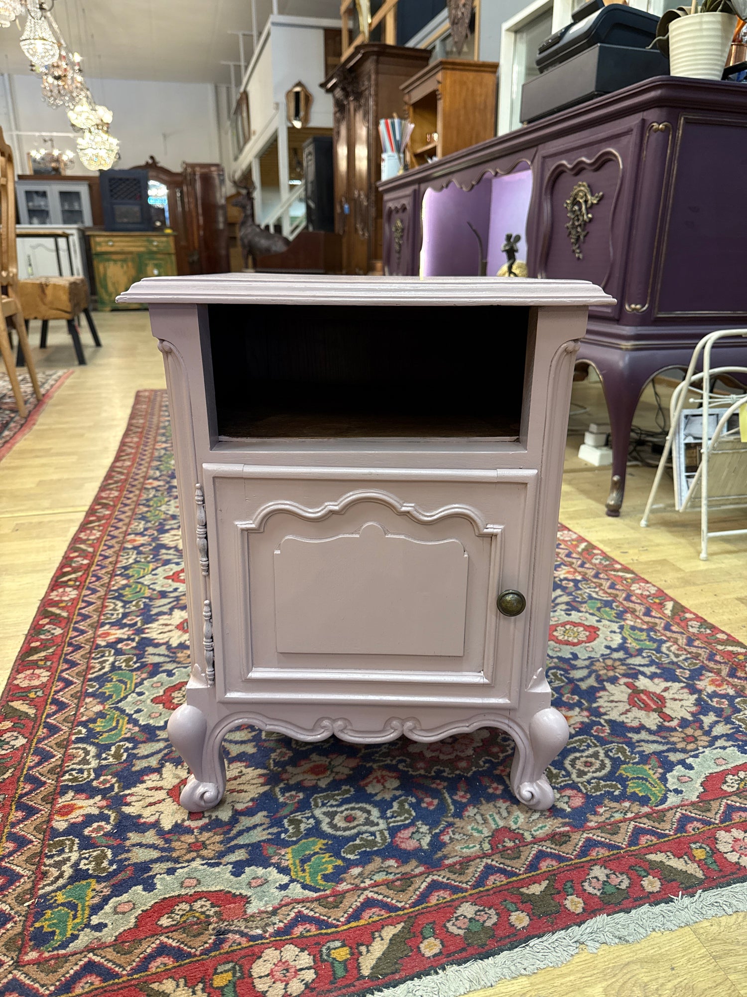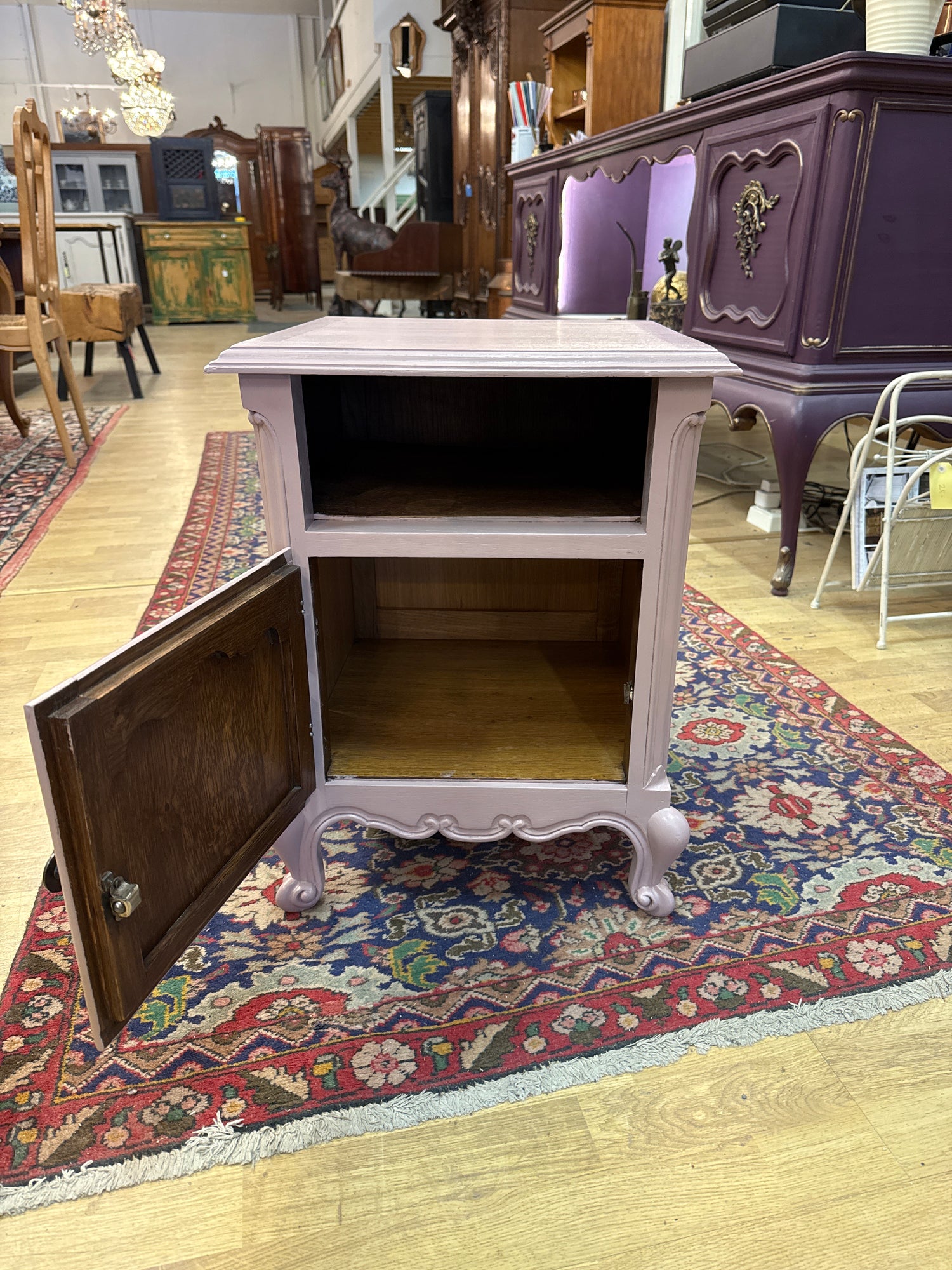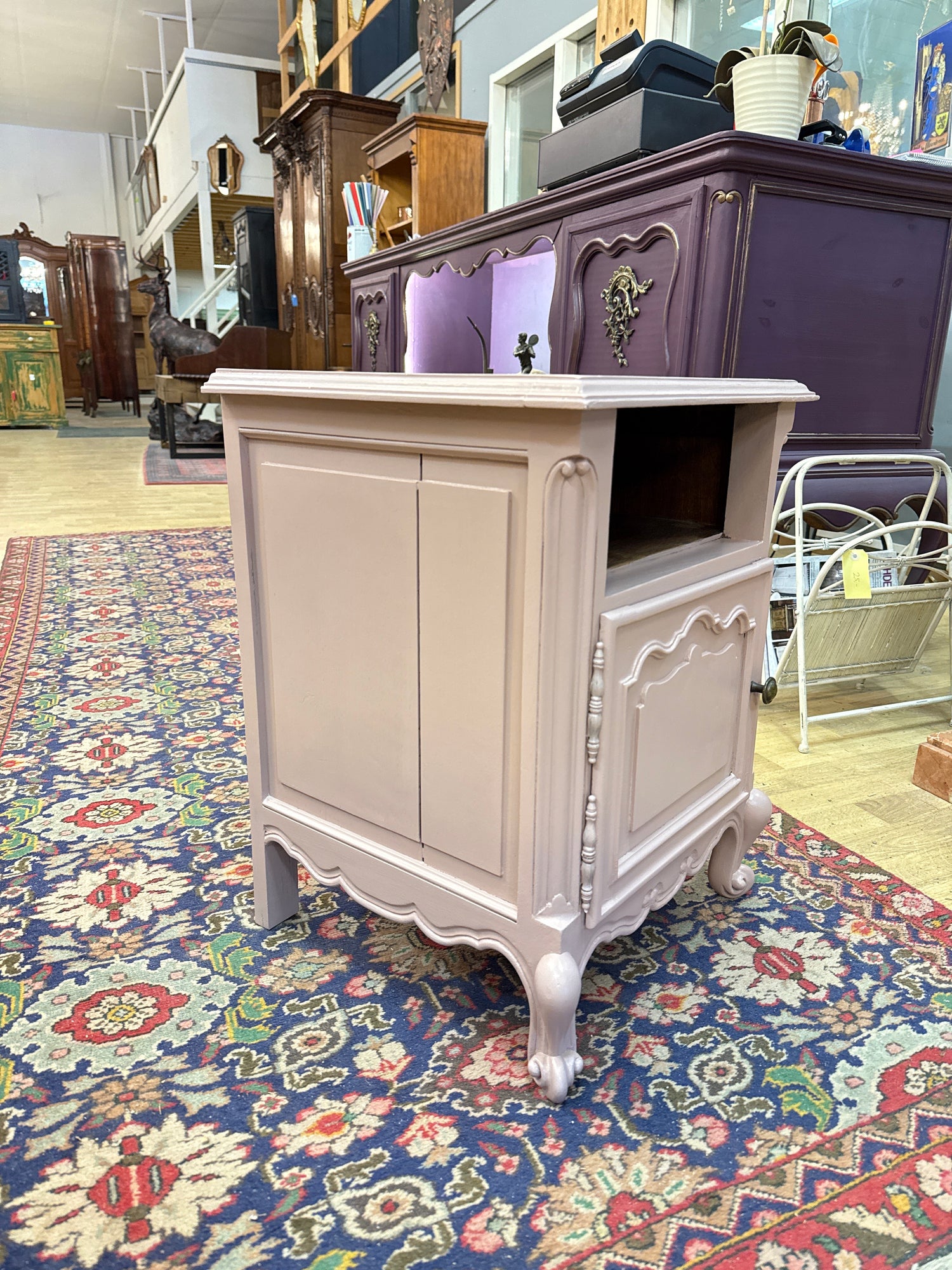 Kaunis vanhan roosan värinen rokokoo-pikkukaappi tai yöpöydäksikin erinomaisesti sopiva kaunis kaluste.