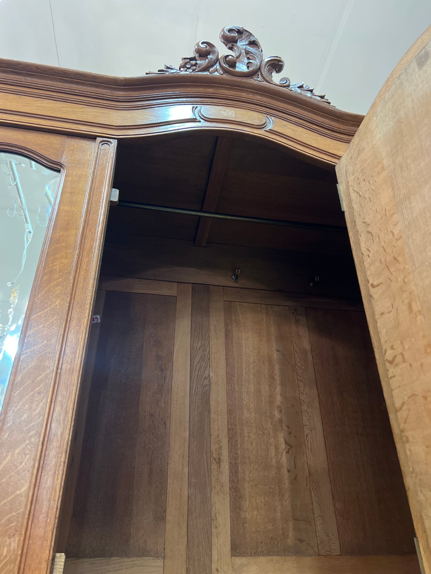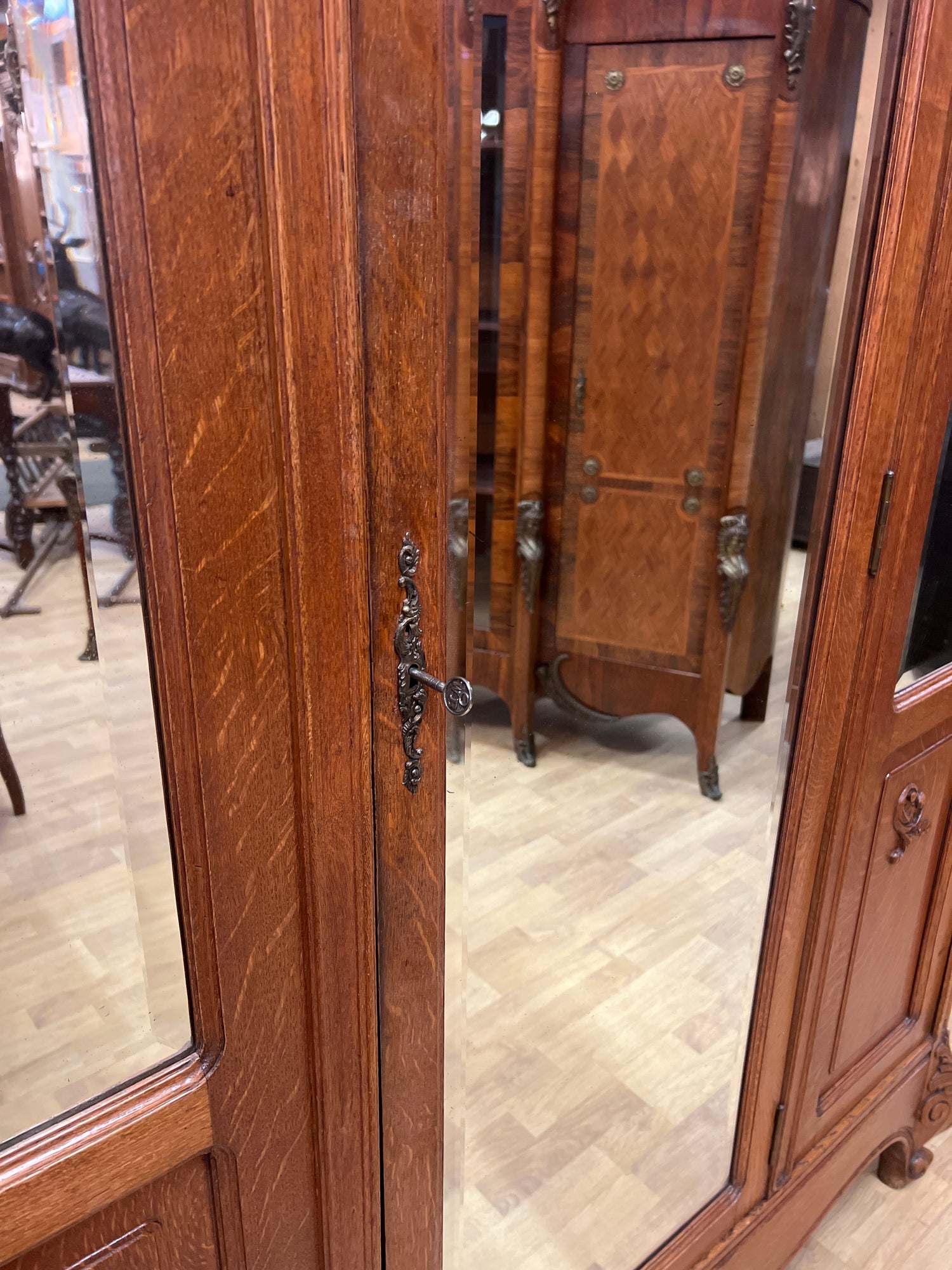 Todella kaunis tamminen rokokoo vaatekaappi fasettihiotuilla peili ovilla. Kaappi on helppo purkaa osiin joten sen saa toimitettua ahtaastakin tilasta sisään. Kaappi toimii hienosti niinkuin pitääkin. Kaappi on 1920–luvun bryggestä belgiasta. Kaapissa on iän tuomaa patinaa ja kulumaa havaittavissa.