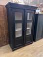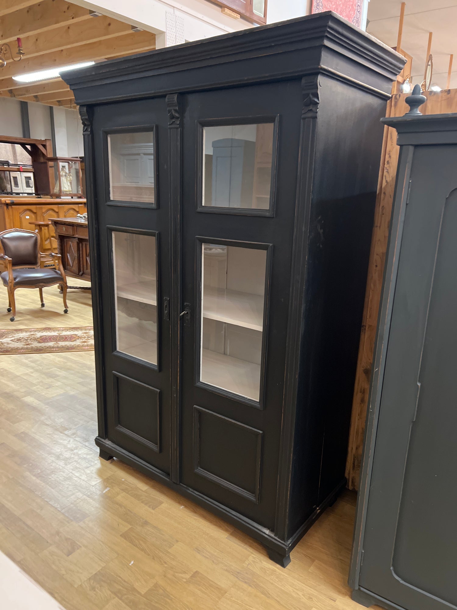 Tyylikäs musta vitriinikaappi vaalealla sisustalla. Kaappi on todella tukeva, jämäkkä ja hyväkuntoinen. Kaikki toimii niinkuin kuuluukin. Kirjakaapiksi, astiakaapiksi, koristevitriiniksi, palkintokaapiksi tai miten vaan! Kaapissa on iän tuomaa patinaa ja kulumaa.. Tästä kaunis kaluste suoraan käyttöön!