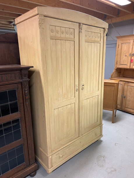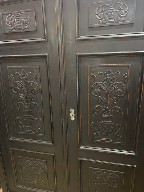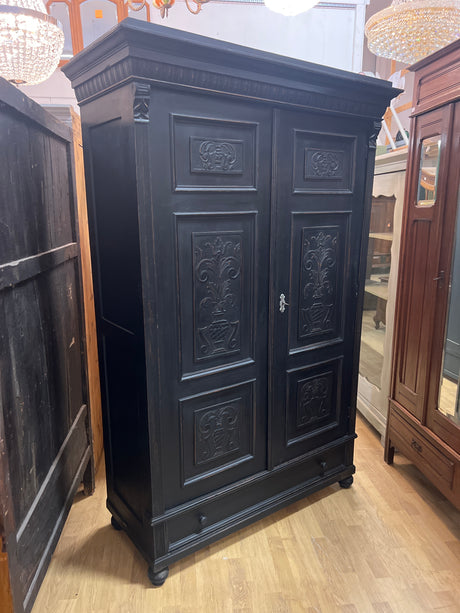 The Neo-Renaissance favored large, stately, showy, and heavy objects. The most popular material was oak, but walnut and mahogany were also used. The wooden parts of the furniture were almost always treated with brown or black. The surface was shellaced to a glossy or matte finish. Typical of the Neo-Renaissance were dining rooms, whose furnishings included a large two-part crockery cabinet with rich decorations. The dining table was plush and often extendable. The edge of the tabletop had a molding, which often had sculptural decoration. The heavy legs were decorated with wire turnings and grooves. The legs of the furniture were straight and turned to shape, the back of the chair was bordered by fluted columns ending in a ball, and the seat was made of rattan, perforated plywood, or upholstered. The chairs were more Baroque than Renaissance in structure. A favorite piece of furniture during the Neo-Renaissance was the panel divan, a large, high-backed sofa with a shelf for decorative items along the back. The sofa's padded armrests folded out to the sides, allowing the soft sofa to be converted into a bed.