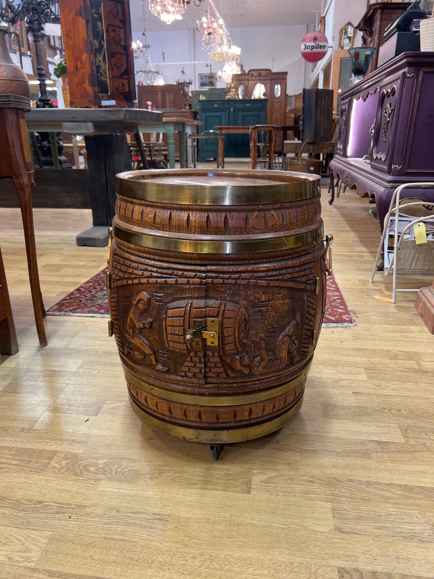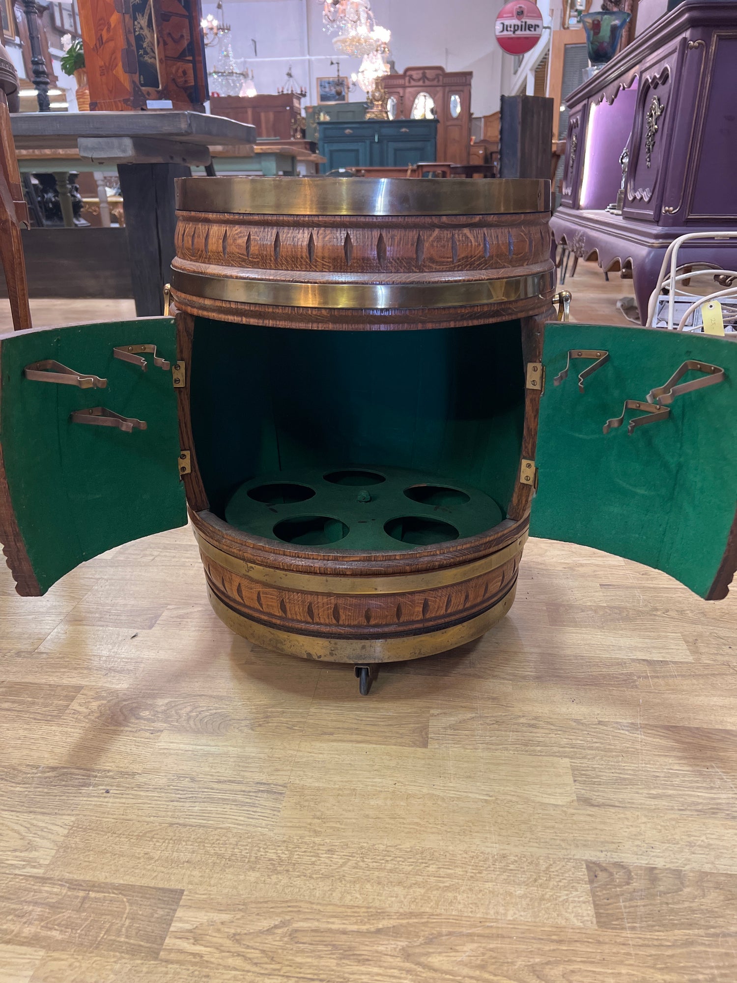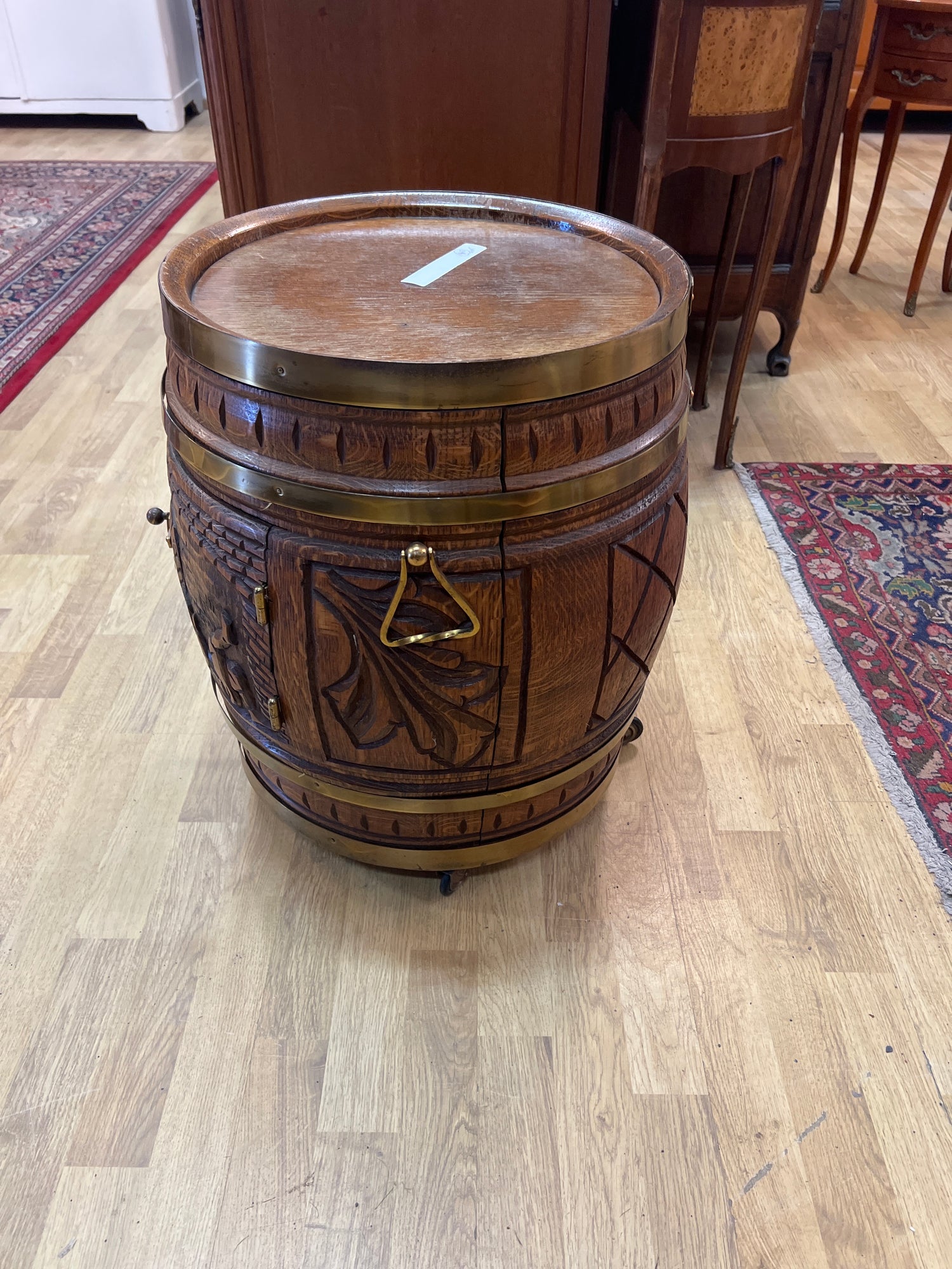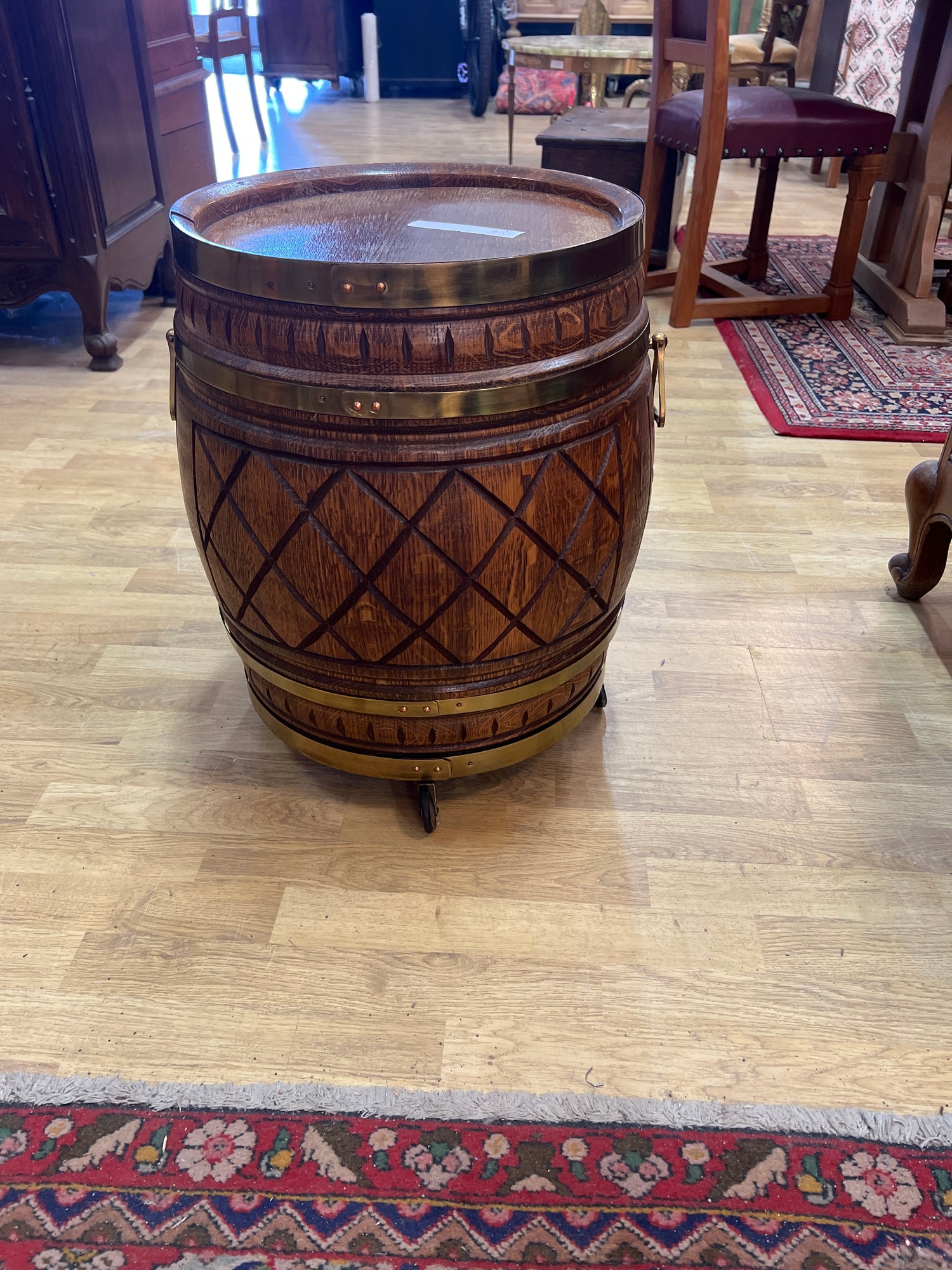 Hieno tammitynnyri baari. Renkaat alla, helppo liikutella.. Tästä hieno sisustuselementti😍